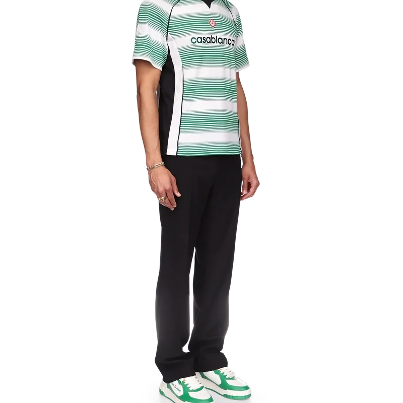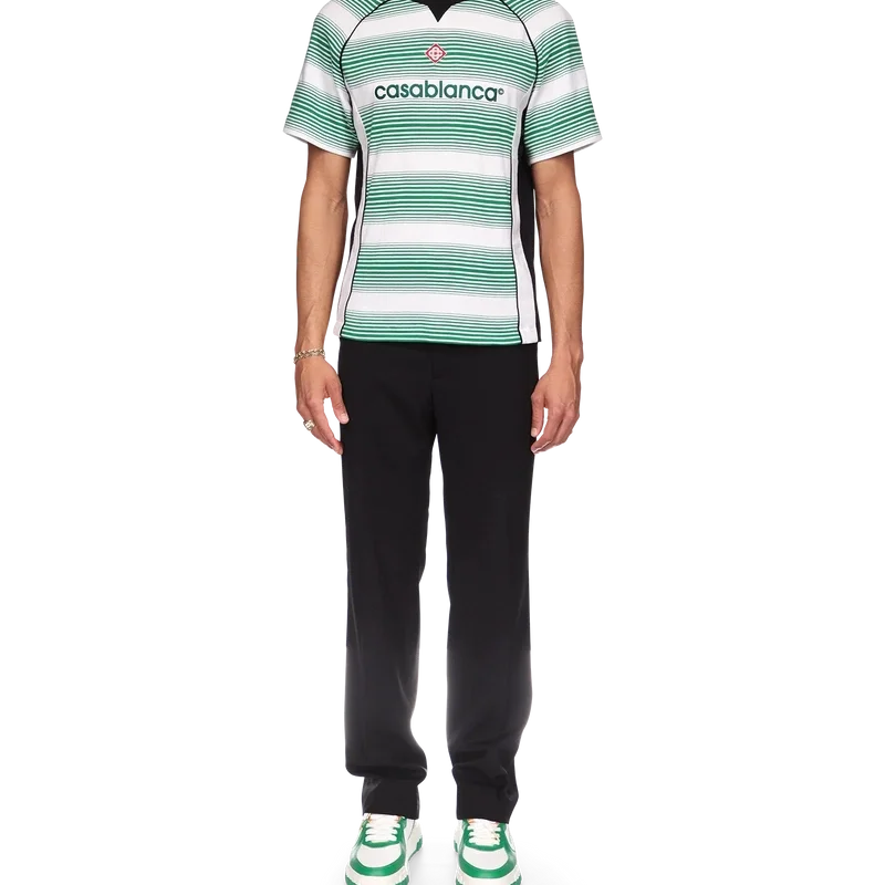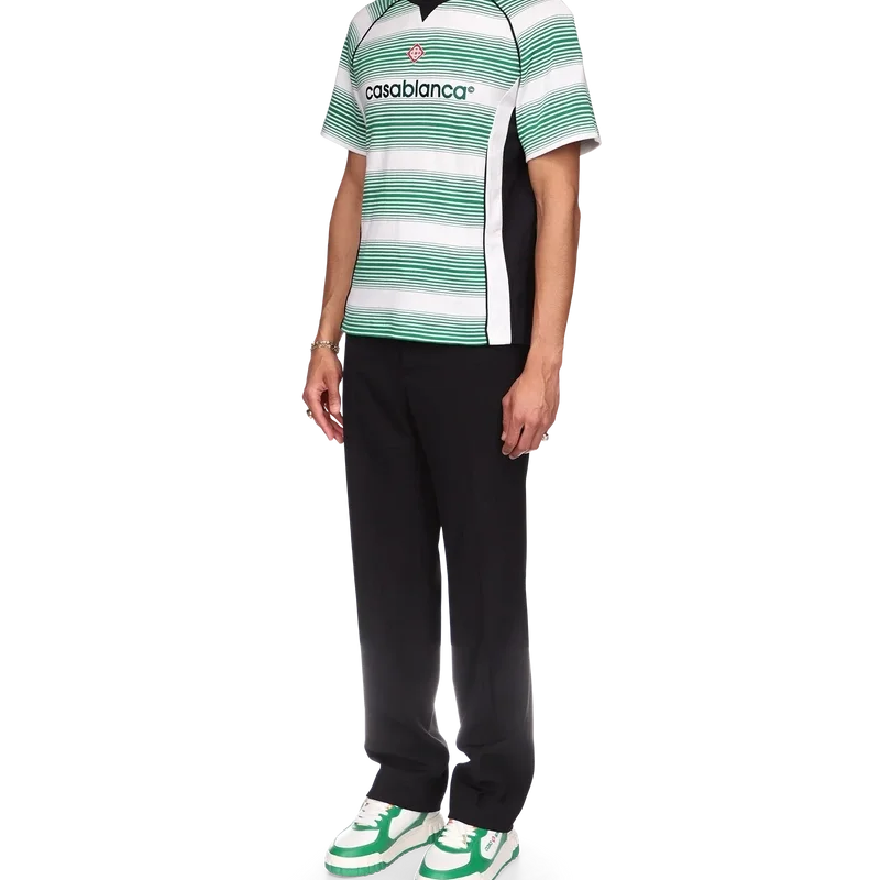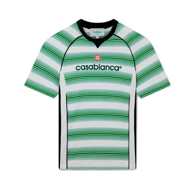 La camiseta de fútbol con paneles de rayas degradadas es un diseño deportivo de manga corta, inspirado en los colores de la bandera de Nigeria. Confeccionada con tejido de algodón orgánico y rematada con el logotipo de diamante característico de la marca, un logotipo de Casablanca en el pecho y un clásico cuello redondo.