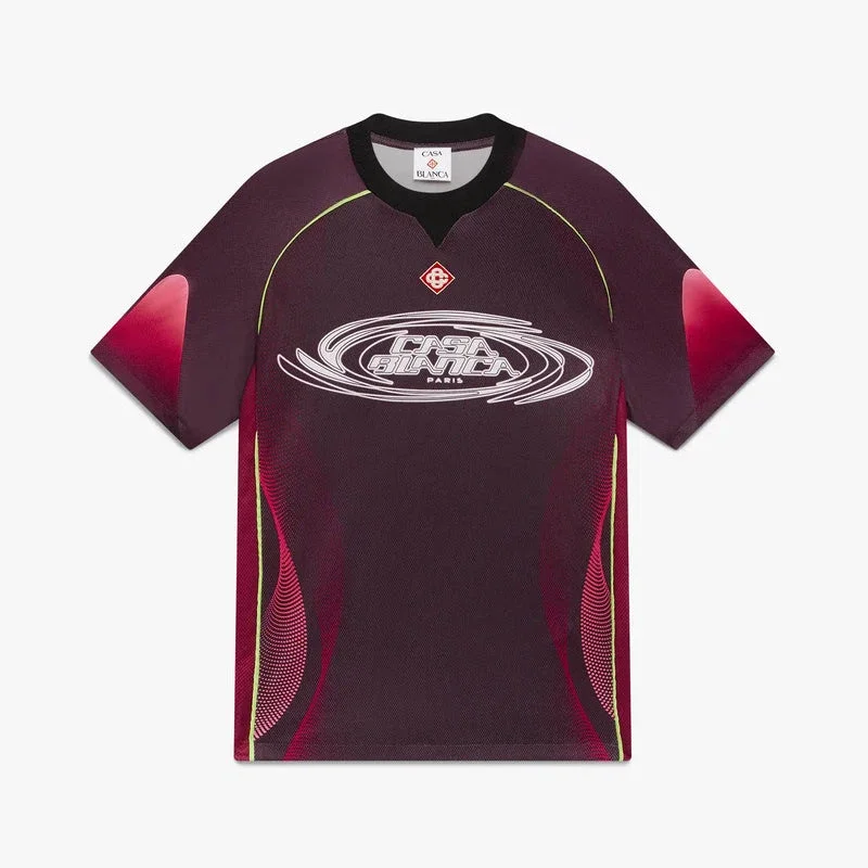 La camiseta de fútbol de manga corta con degradado berenjena presenta un diseño refinado, con el estampado degradado de la temporada que emula los intensos colores de la berenjena. Se completa con el parche del logotipo de diamante característico de la casa y el logotipo de Casablanca en el pecho, con un clásico cuello redondo.