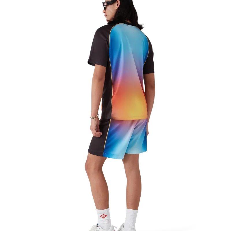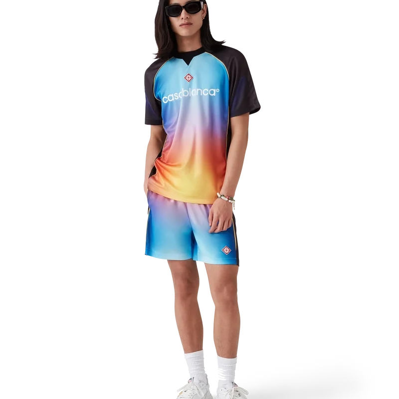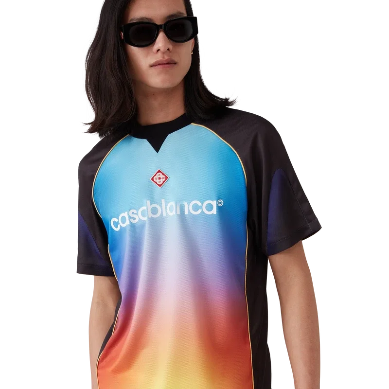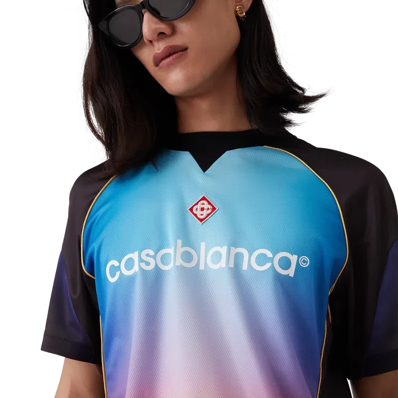 La camiseta de fútbol Gradient es un diseño deportivo de manga corta confeccionado con tejido de malla Birdseye estampado que presenta una serie de colores vibrantes que representan una interpretación futurista del degradado Casablanca, una forma de halo inspirada en carteles y discos vintage de ciencia ficción. Se completa con el parche del logotipo de diamante característico de la casa y el logotipo de Casablanca en el pecho, con un cuello redondo clásico.