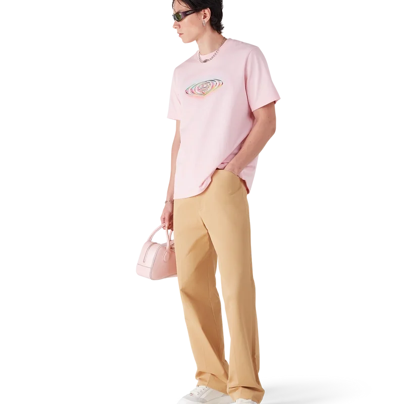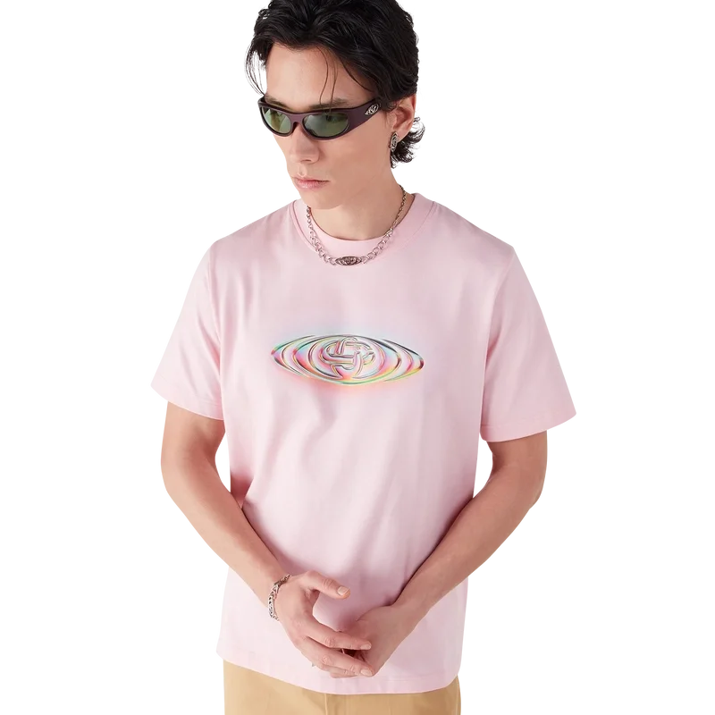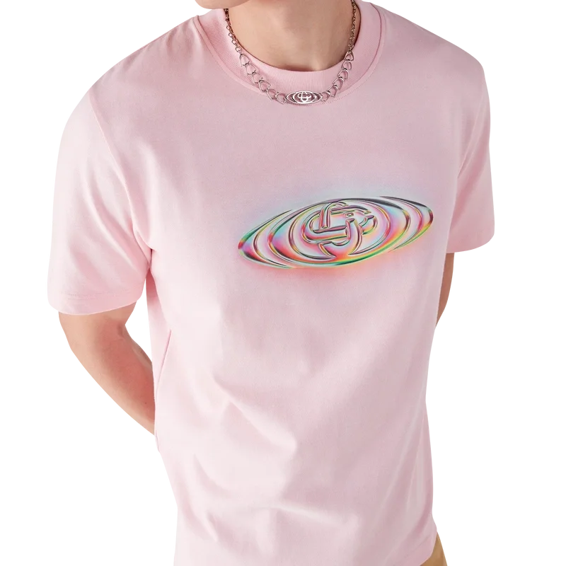 La camiseta de manga corta con logotipo de cristal presenta un diseño refinado, desarrollado en colaboración con Martin Naumann, con ilustraciones distintivas que exploran transiciones degradadas y efectos visuales texturizados. El diseño experimenta con el logotipo de la marca para lograr un equilibrio armonioso entre los semitonos y la estética inspirada en el cristal. Se completa con cuello redondo y mangas cortas en una silueta holgada.