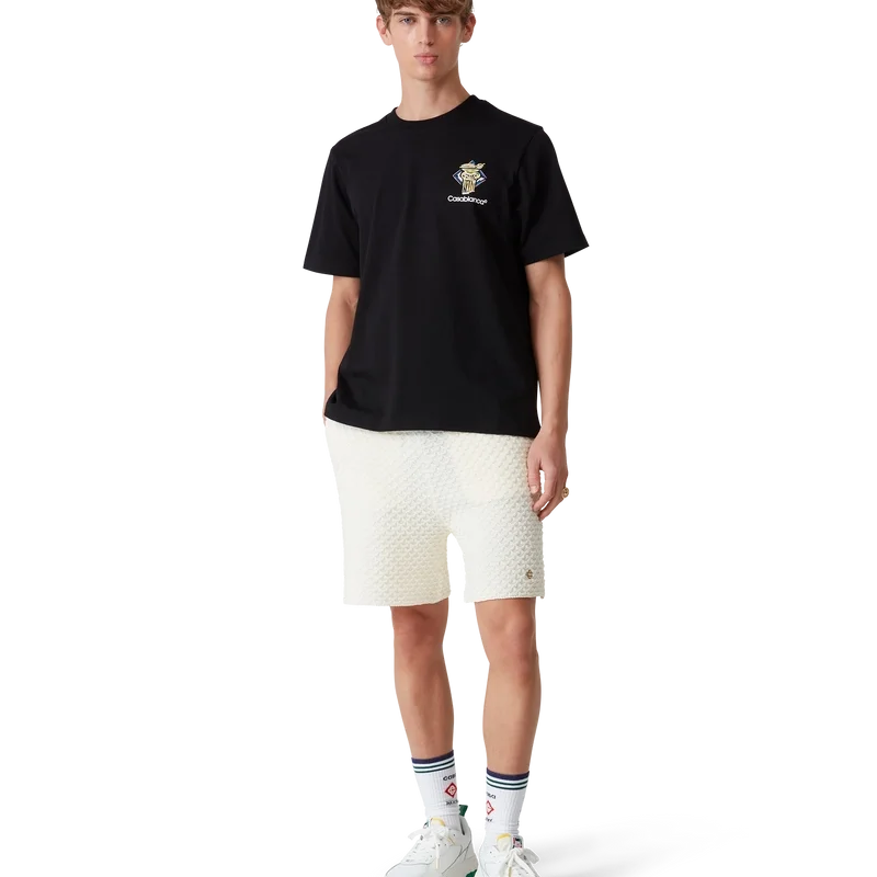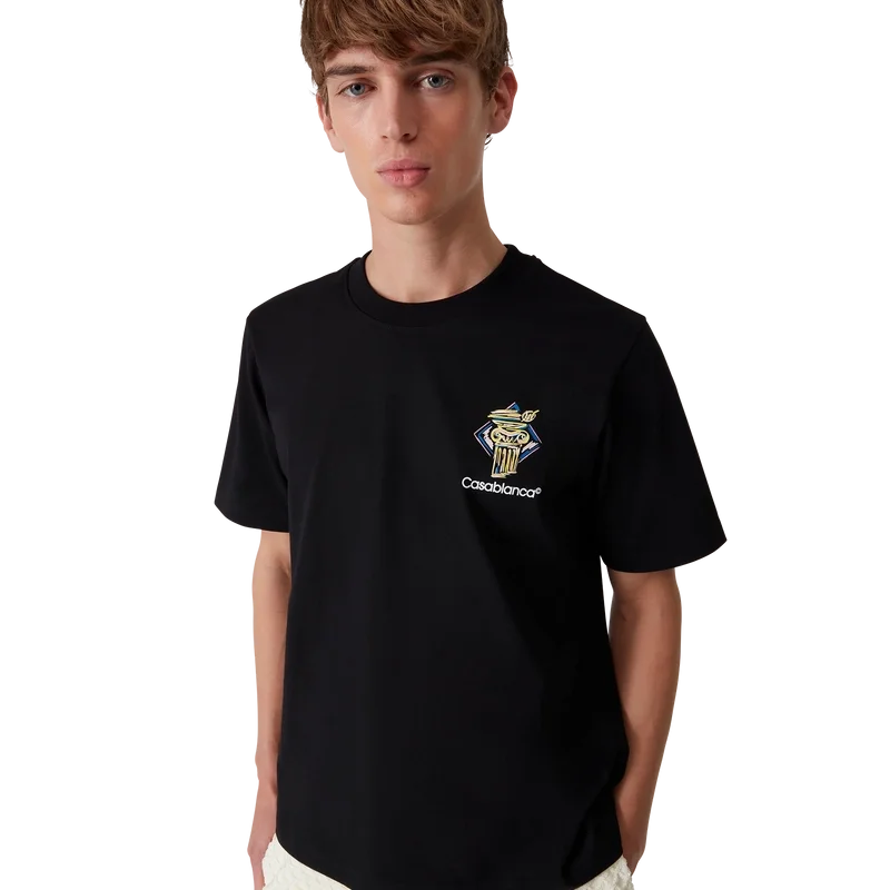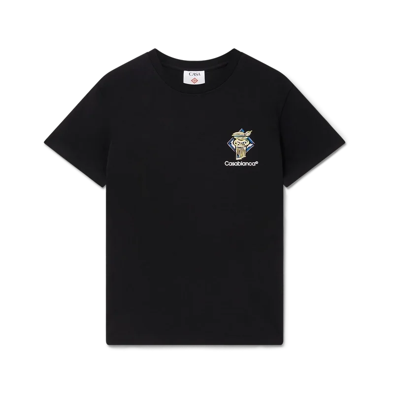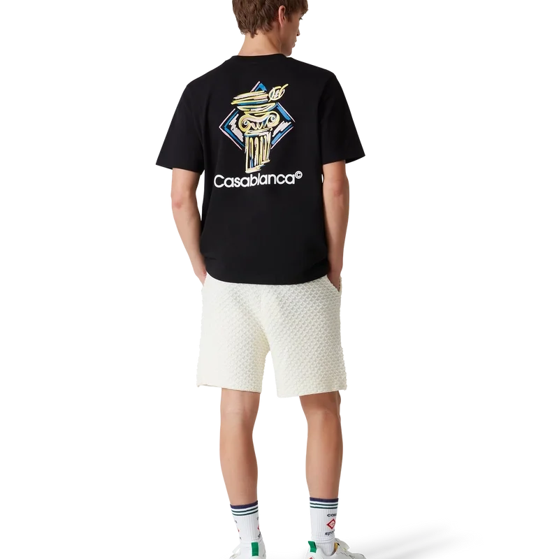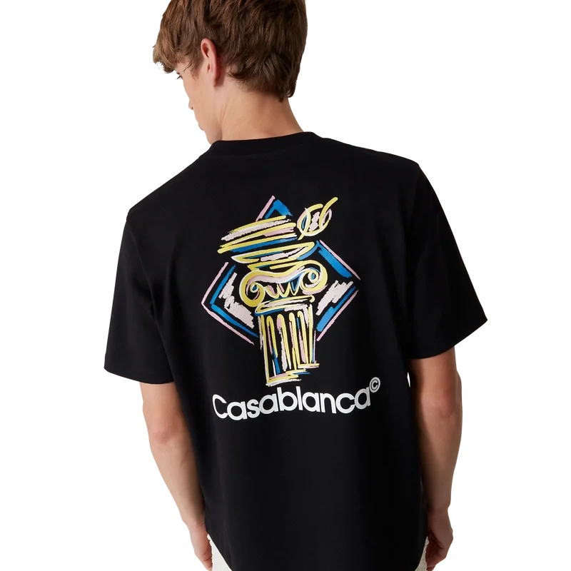 La camiseta Diamond Column es un diseño estampado de manga corta confeccionado en tejido de algodón orgánico con la iconografía de una columna de la casa representada con lápices de colores. Se completa con un cuello redondo clásico y el logotipo de Casablanca.