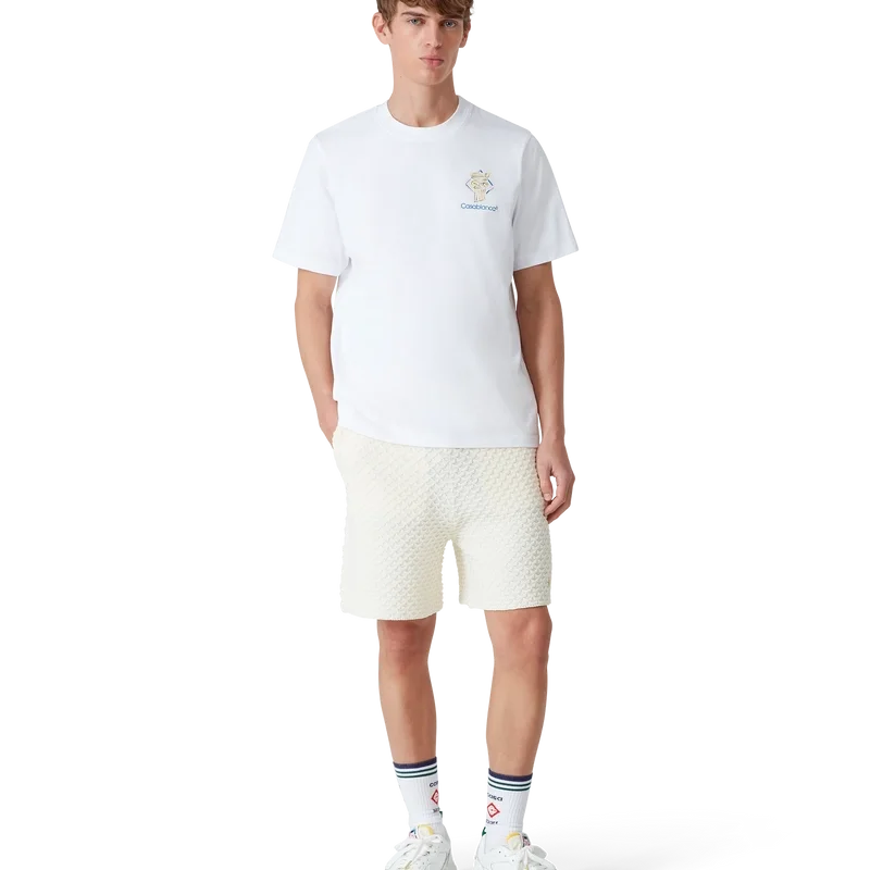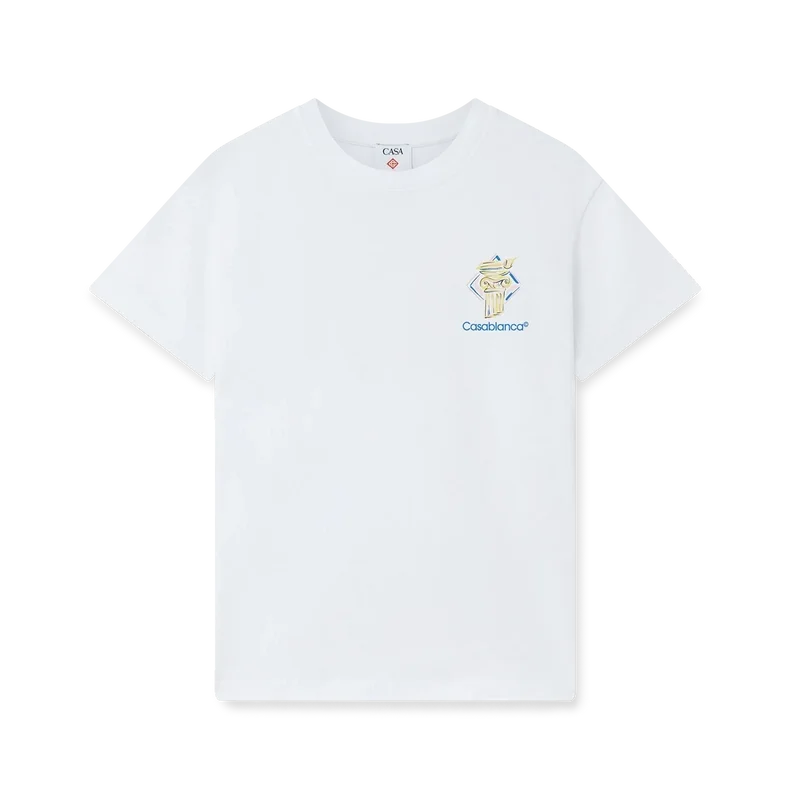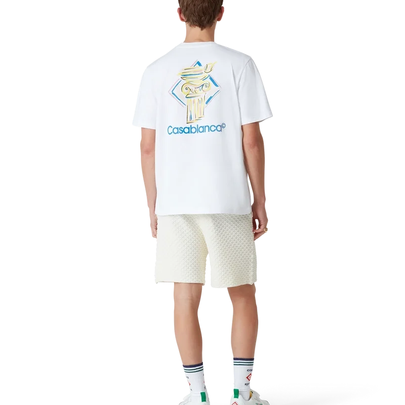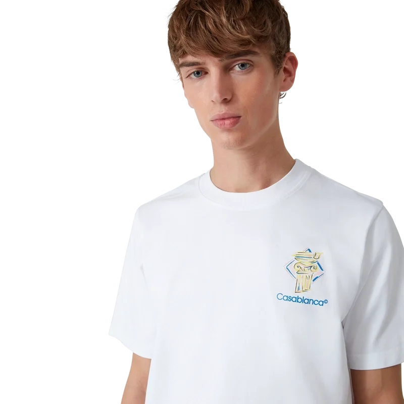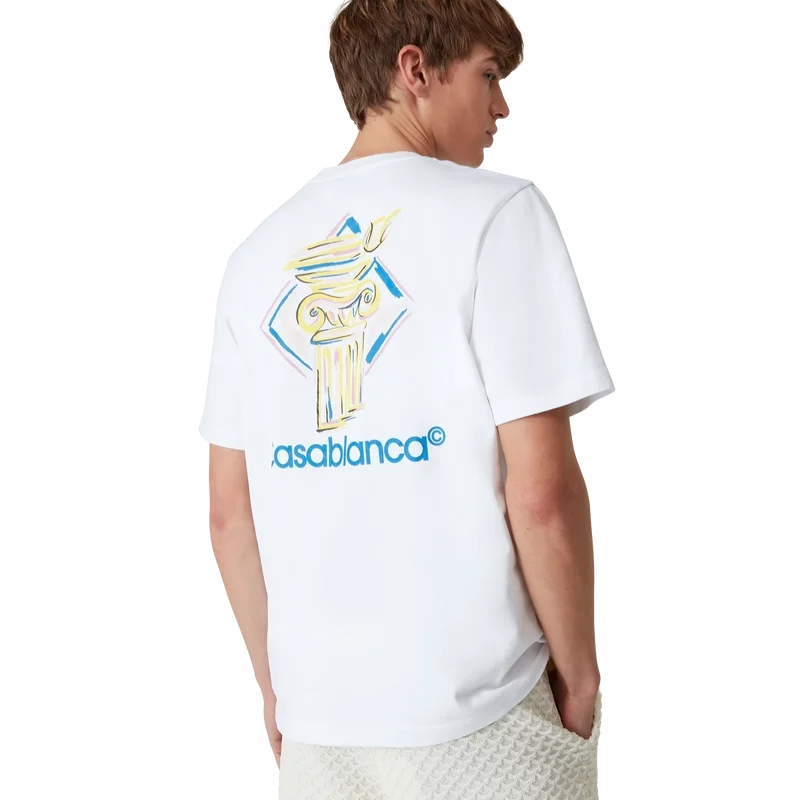 La camiseta Diamond Column es un diseño estampado de manga corta confeccionado en tejido de algodón orgánico que presenta la iconografía de una columna a lápiz de la marca. Se completa con un cuello redondo clásico y el logotipo de Casablanca.