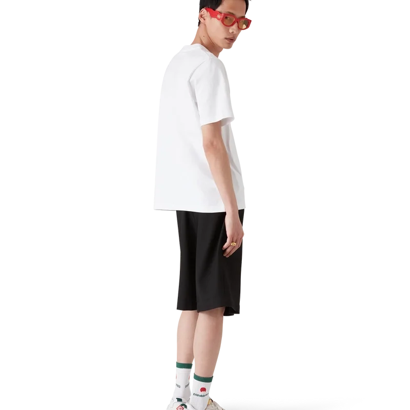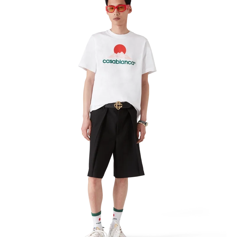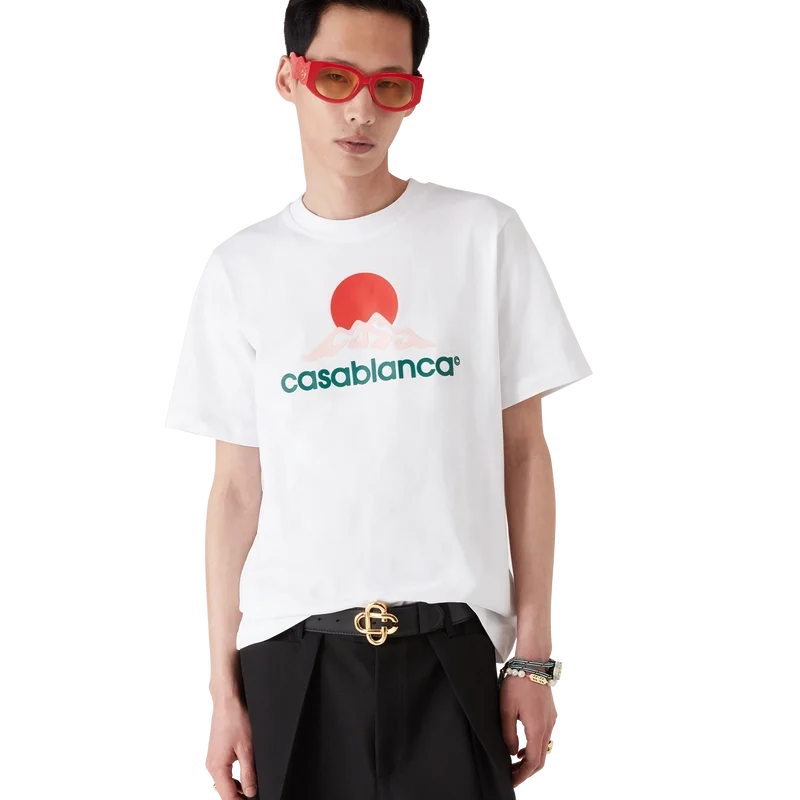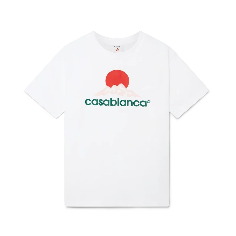 La camiseta Montagne es un diseño de manga corta confeccionado en tejido de algodón orgánico que presenta el diseño de temporada de la casa, Casa Montagne: un logotipo que a primera vista parece una montaña, pero que al mirarlo más de cerca se lee como «Casa». Se completa con un clásico cuello redondo.