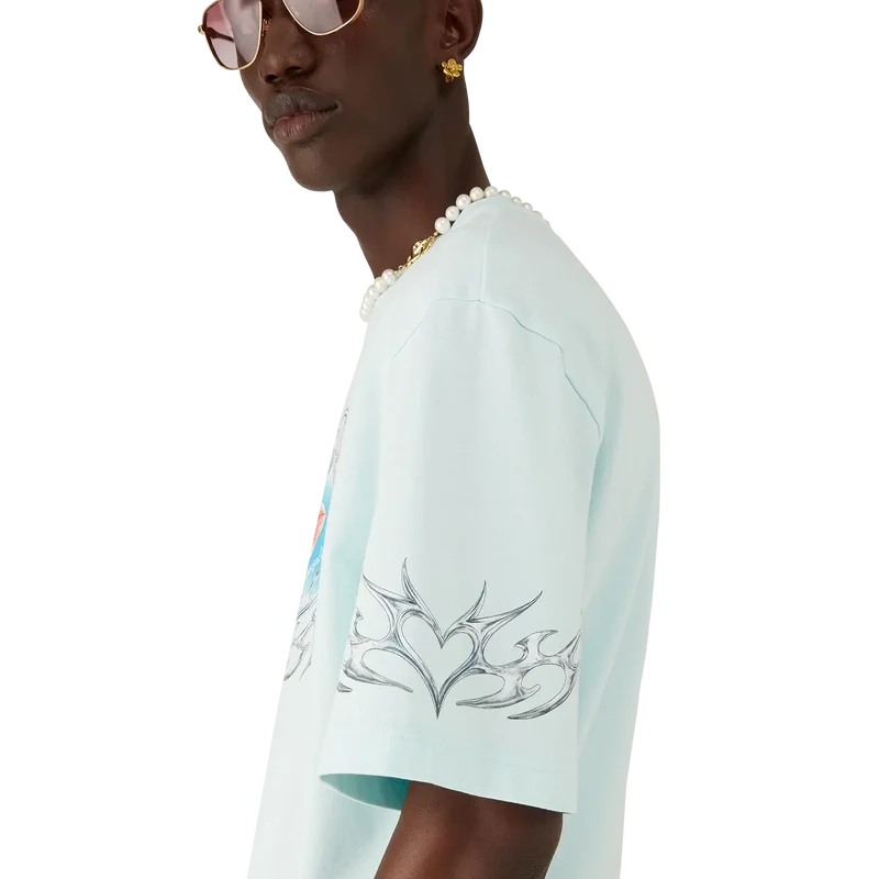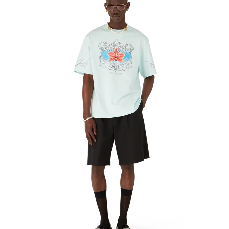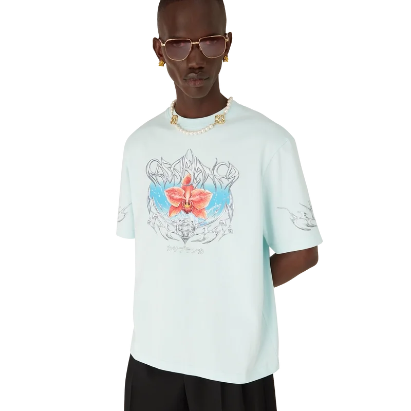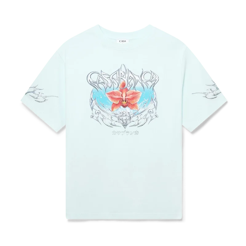 La camiseta oversize The Blades presenta un diseño estampado con ilustraciones que juegan con el contraste entre dos sensaciones opuestas: el filo de la hoja y el frío del cromo plateado, en contraste con la calidez de la naturaleza, como los tonos rosa y rojo intensos de una flor de orquídea. La incorporación del agua aporta un elemento fresco y nítido al diseño. Se completa con un clásico cuello redondo.