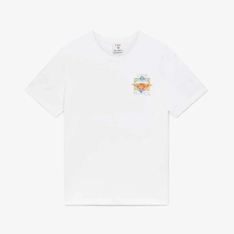 La camiseta de manga corta White Flower Court Icon presenta un diseño refinado con un estampado en el que marcos interconectados crean nichos de diferentes escenas que describen la trascendencia del tiempo y el espacio a través del enfoque del deporte. Se completa con un cuello redondo clásico y una silueta holgada.
