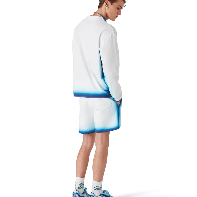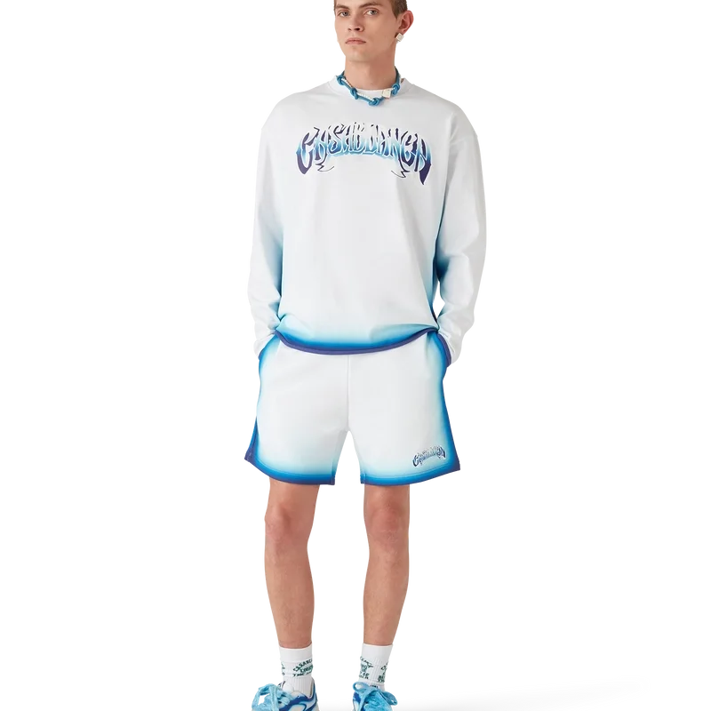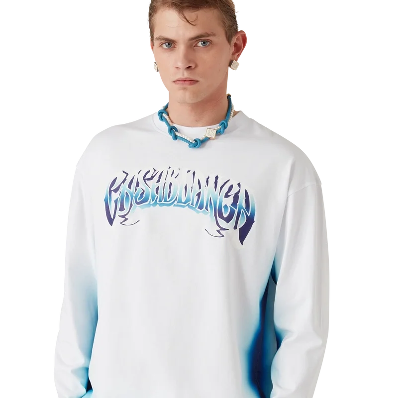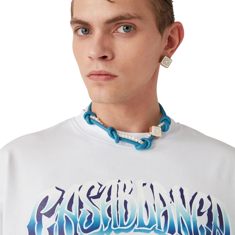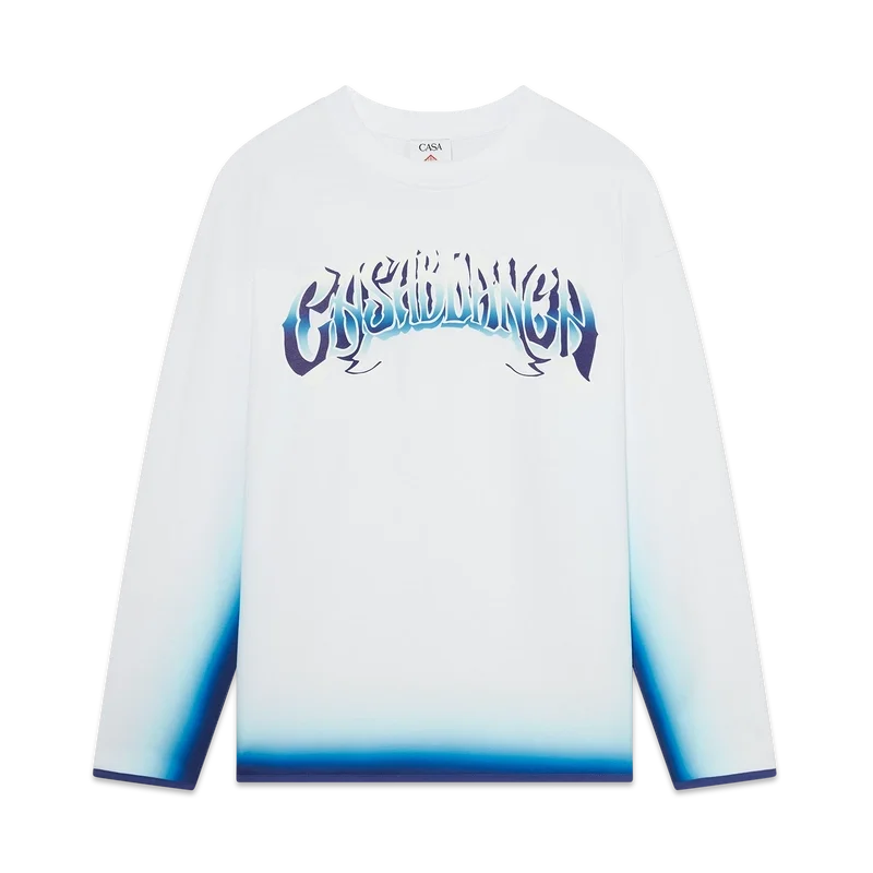 La camiseta de manga larga Blue Fade es un diseño estampado confeccionado en tejido de algodón orgánico y presenta una tipografía dibujada a mano del logotipo de Casablanca, inspirada en la tipografía gótica utilizada en los tatuajes. Se completa con un cuello redondo clásico.