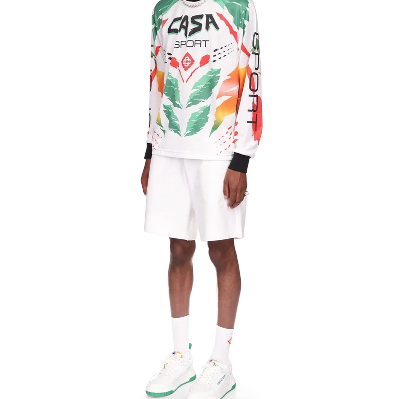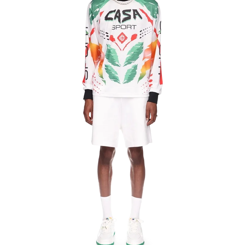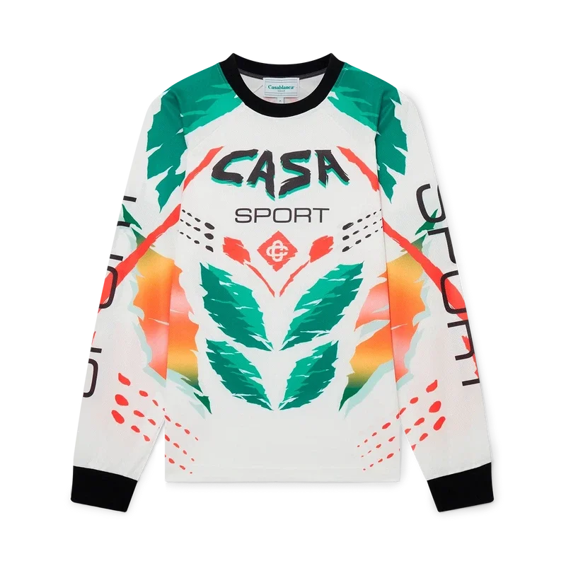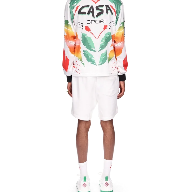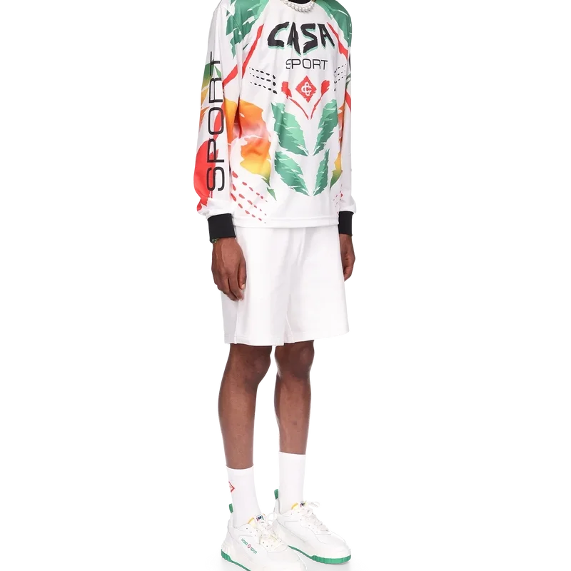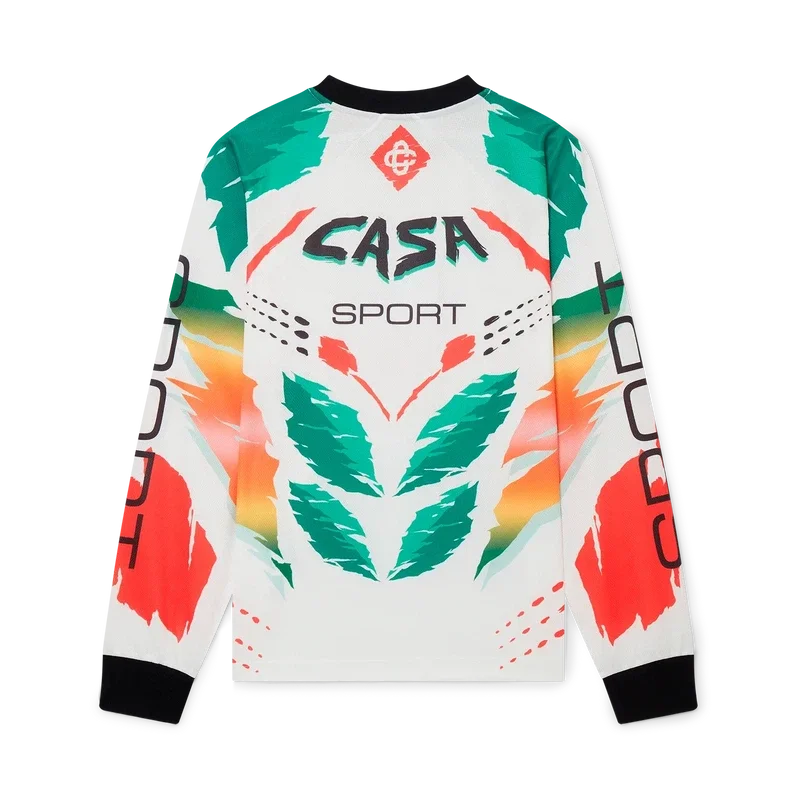 La camiseta de manga larga Casa Moto presenta un diseño estampado de inspiración deportiva con el logotipo de las dos C entrelazadas de la casa y los cálidos colores de la temporada, representativos de los ricos intercambios entre disciplinas culturales en el arte, la música y el cine africanos. Se completa con cuello y puños acanalados en contraste.