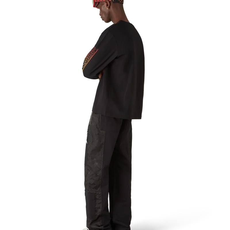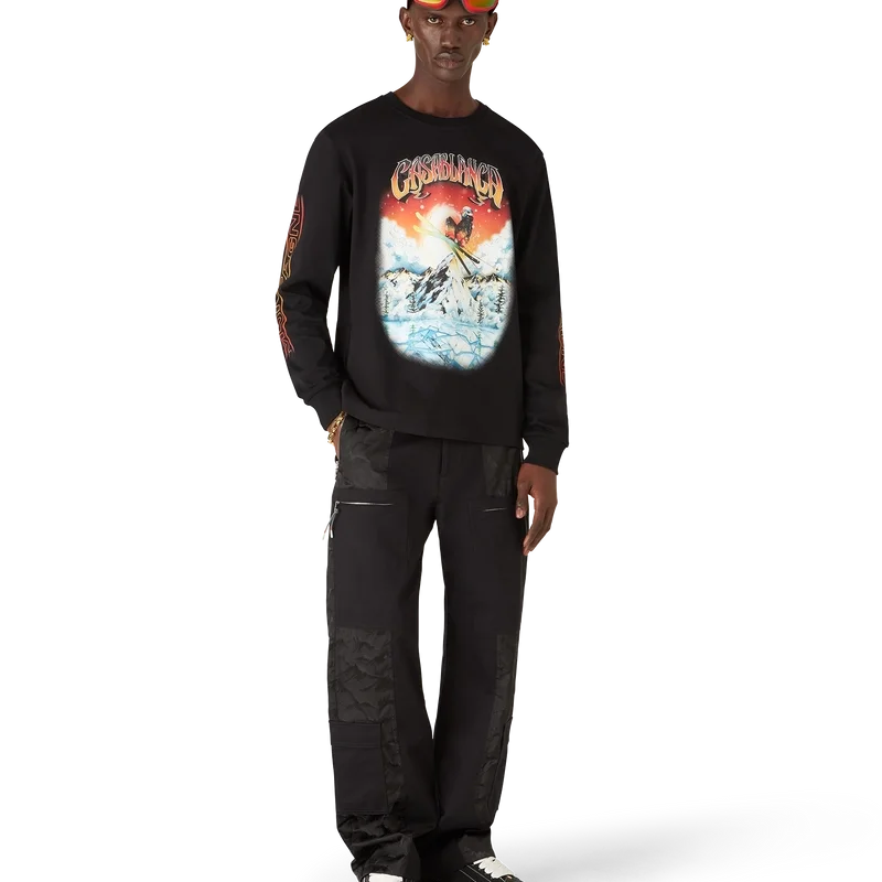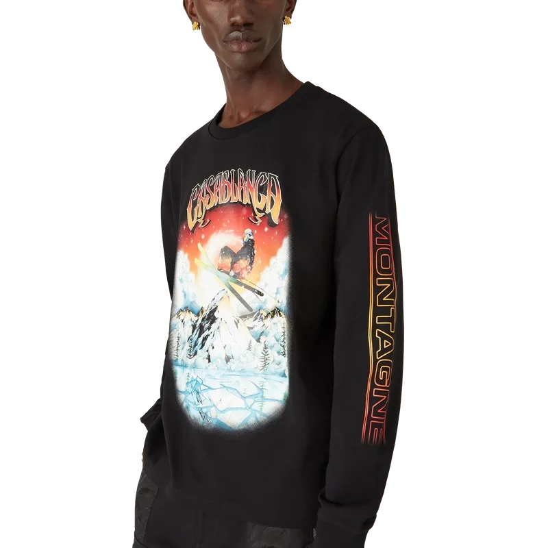 La camiseta de manga larga Ski es un refinado diseño de Apras-Sport confeccionado en jersey de algodón orgánico en color negro, inspirado en la belleza natural de la naturaleza, representada por la vibrante puesta de sol sobre el contorno irregular de la silueta de la cima de la montaña. El degradado del cielo rojo ardiente realza la intensidad dramática del paisaje alpino. Con el estampado Montagne en las mangas en un explosivo degradado naranja.