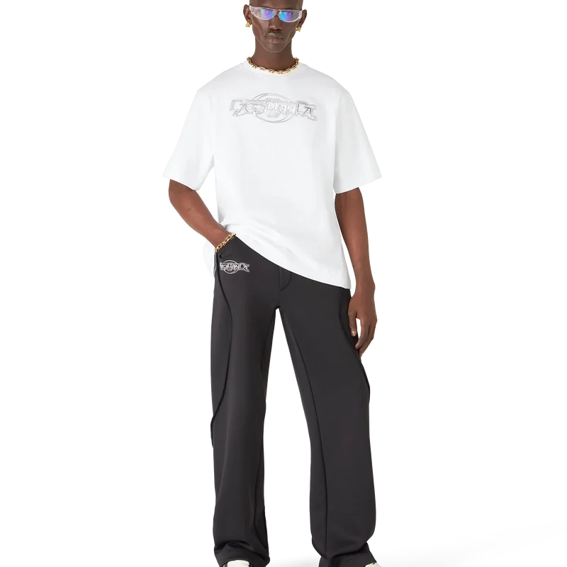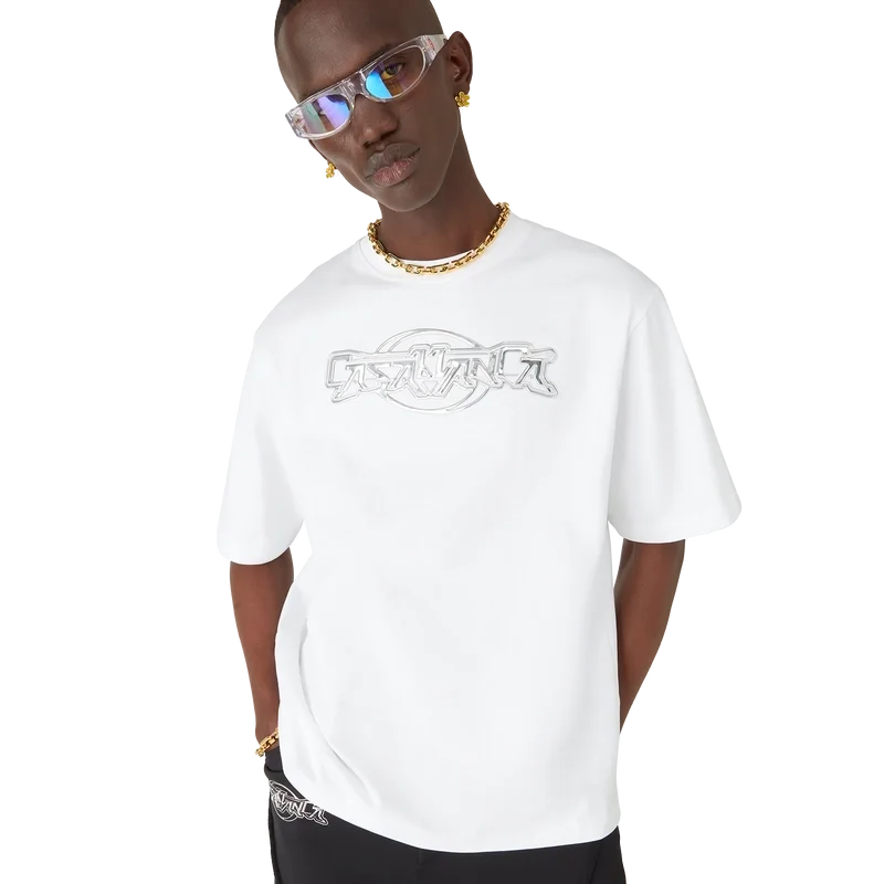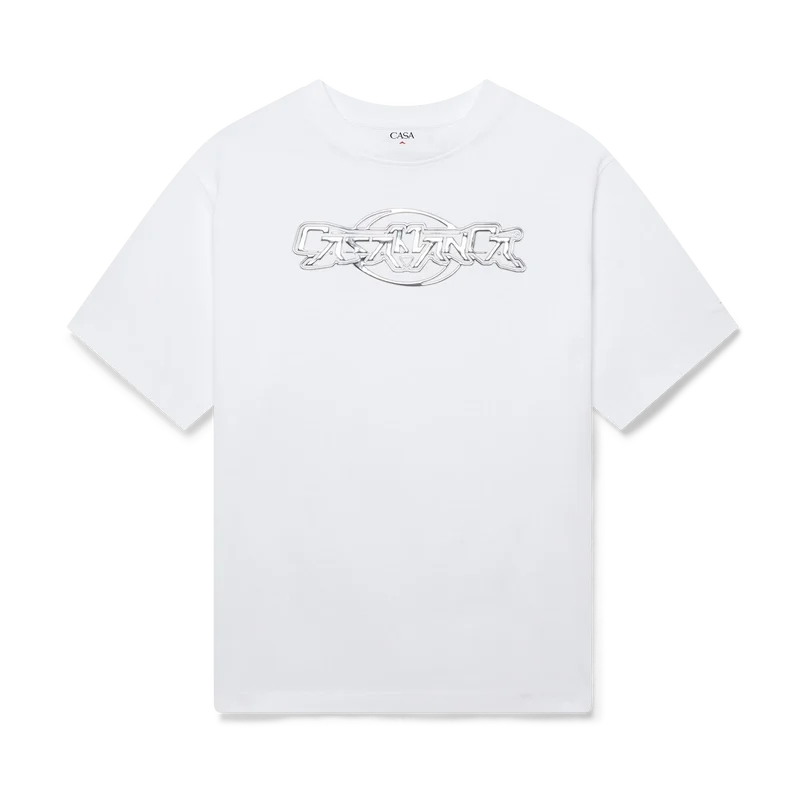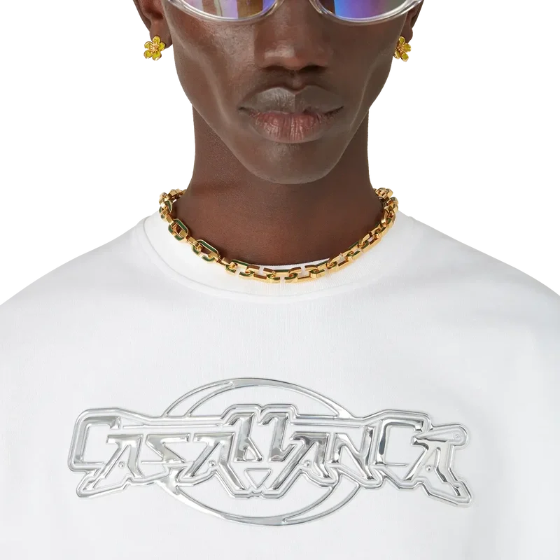 La camiseta oversize Casablanca Chrome es un diseño de manga corta confeccionado en tejido de algodón orgánico con el logotipo de Casablanca en letras cromadas. Se completa con un cuello redondo clásico.