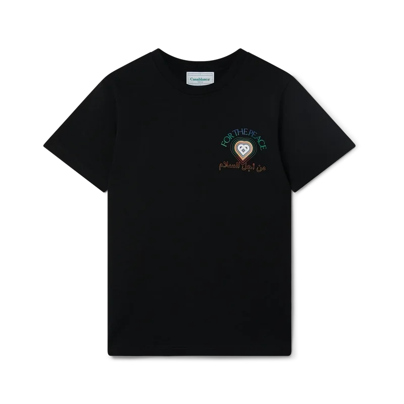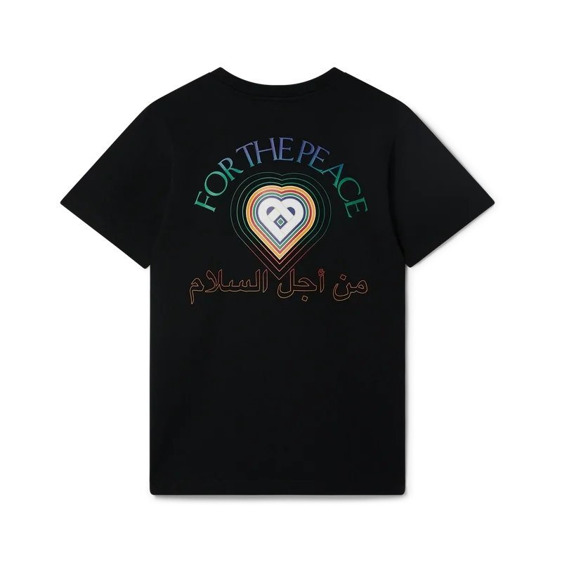 La camiseta negra de algodón orgánico «For the Peace» presenta el diseño de temporada «For the Peace», un homenaje a quienes luchan contra todo tipo de opresión y allanan el camino hacia un futuro mejor para todos. Cuenta con cuello redondo clásico, mangas cortas y etiqueta con la marca Casablanca Paris, diseñada para un ajuste holgado.