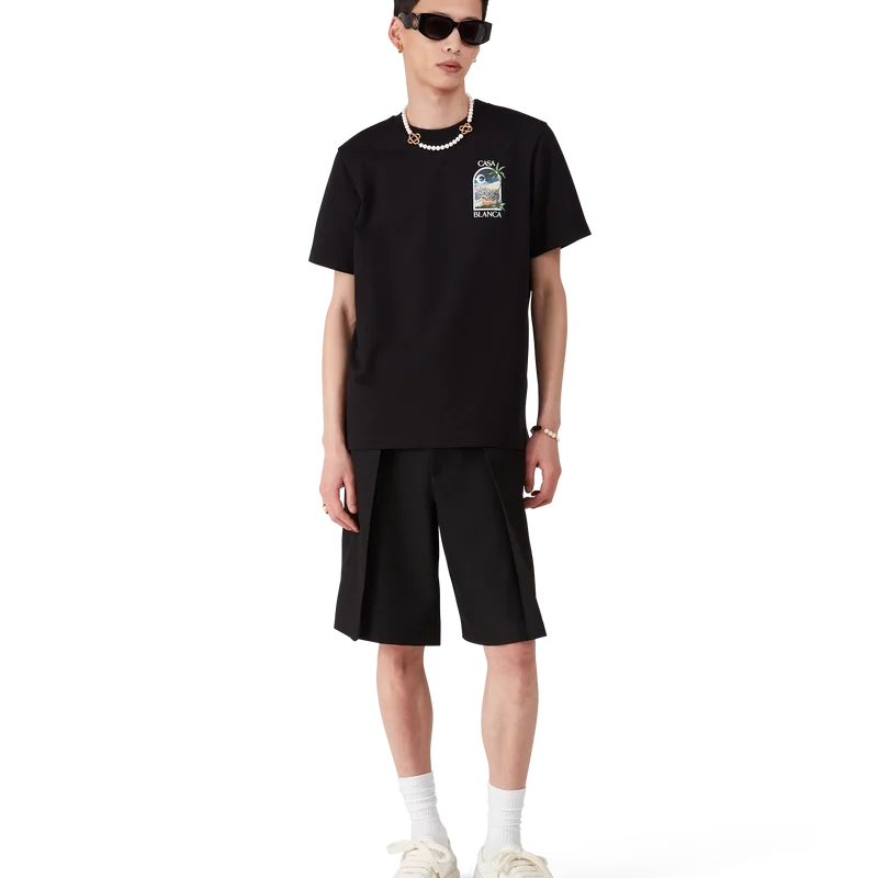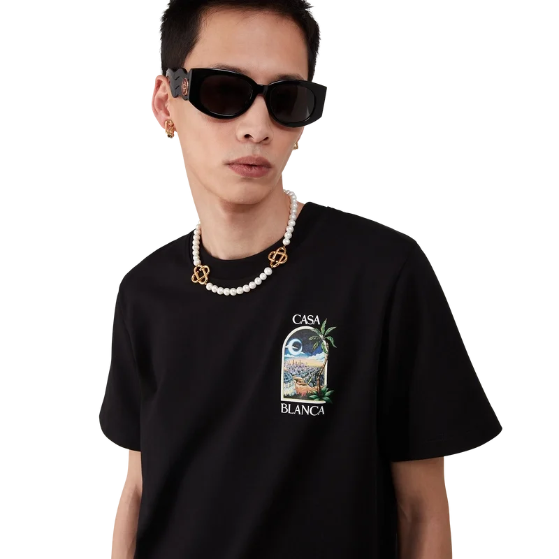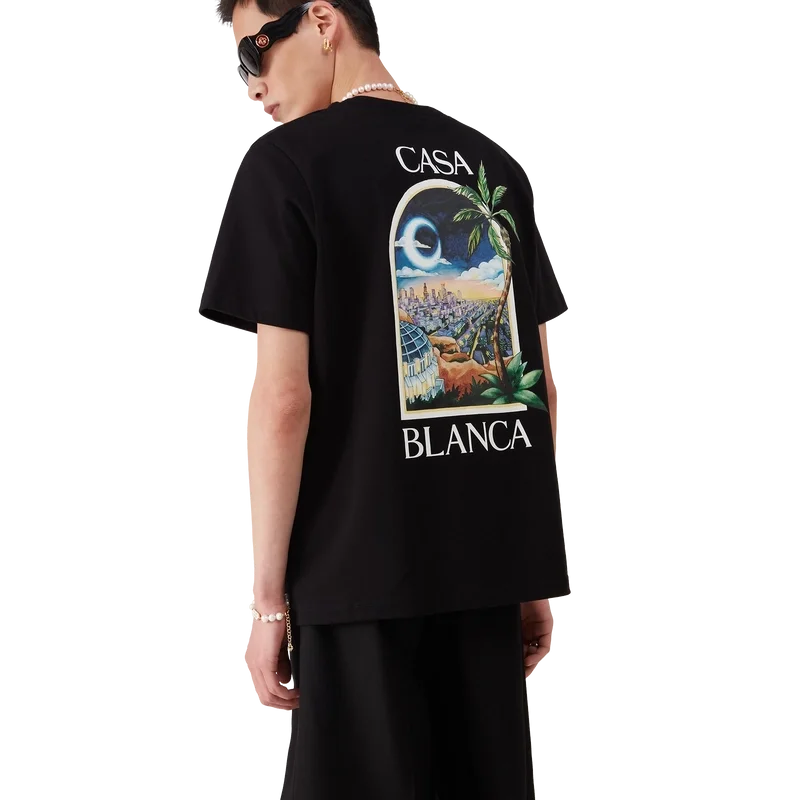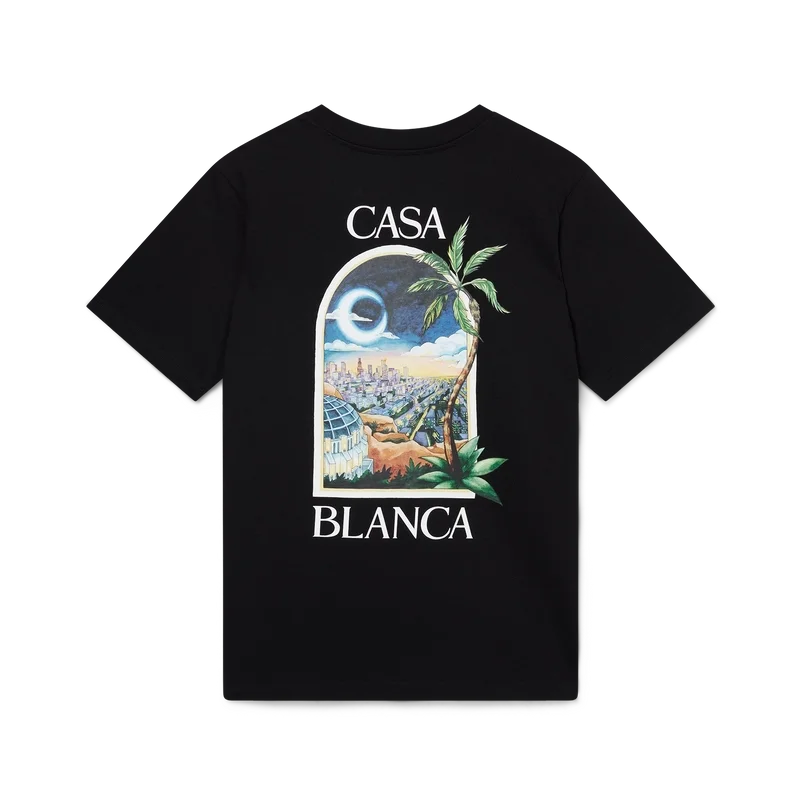 La camiseta La Nights es un diseño estampado de manga corta confeccionado en tejido de algodón orgánico y presenta un diseño característico que representa una ventana a un paisaje nocturno de Los Ángeles. Con cuello redondo clásico.
