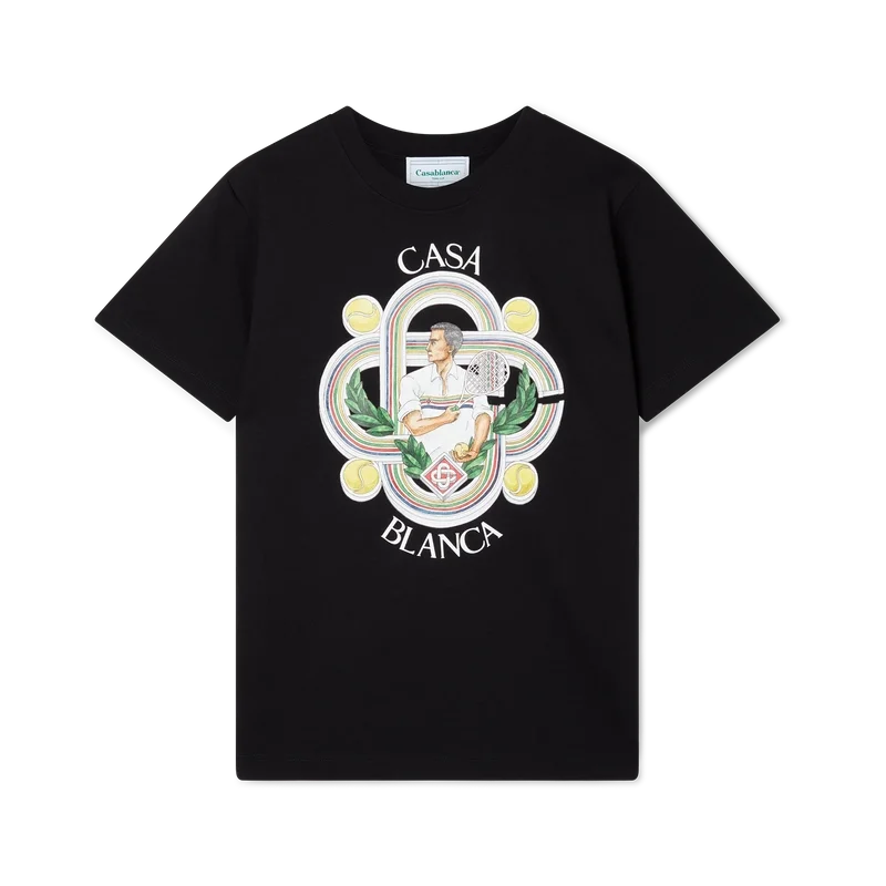 La camiseta de algodón orgánico serigrafiada Le Joueur presenta un diseño de temporada que incorpora la iconografía tenística característica de la casa. Cuenta con cuello redondo clásico, mangas cortas y etiqueta con la marca Casablanca Paris, diseñada para un ajuste relajado.