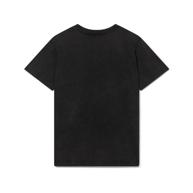La camiseta «Music for the People» es un diseño estampado de manga corta confeccionado en tejido de algodón orgánico negro desgastado, con el diseño de temporada de la casa. Cuenta con un cuello redondo clásico y una etiqueta con la marca Casablanca.