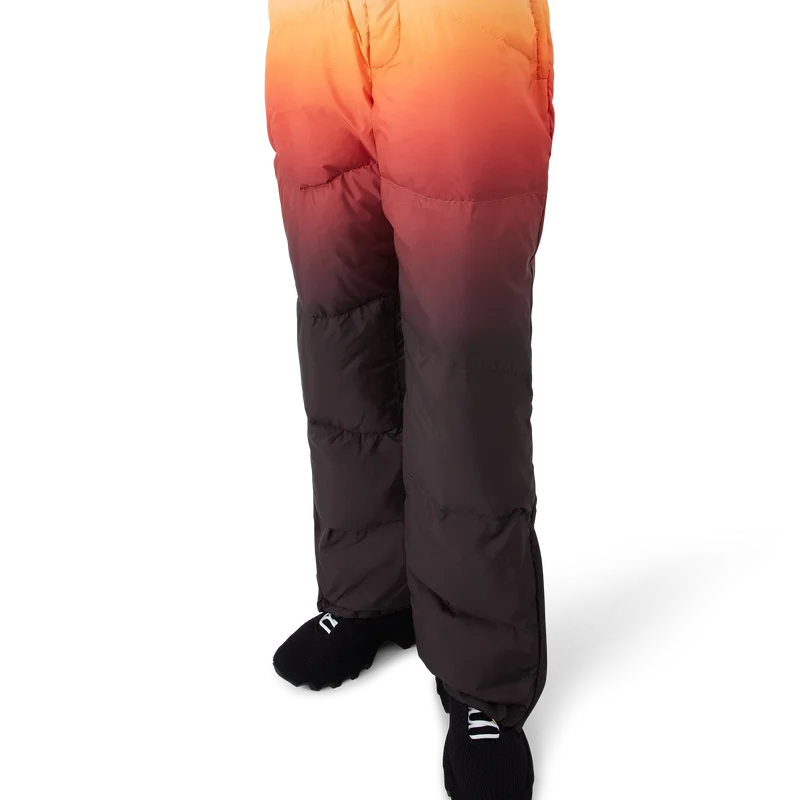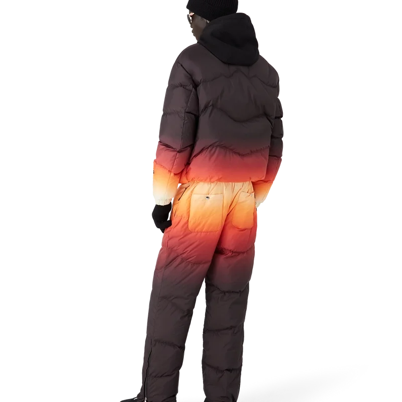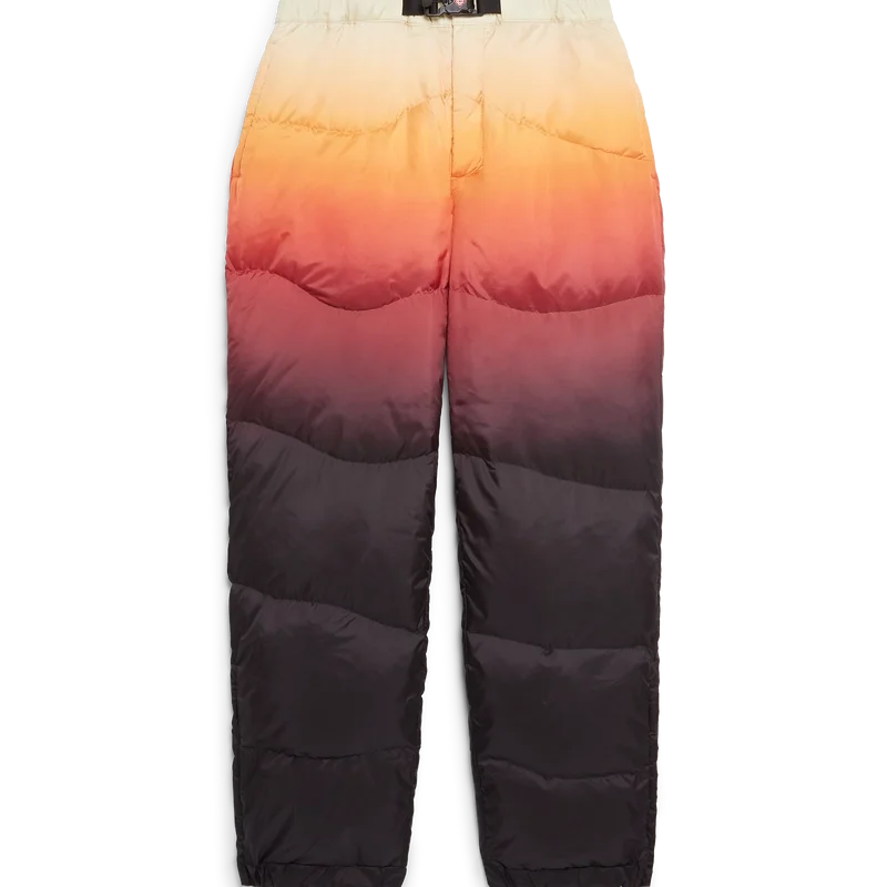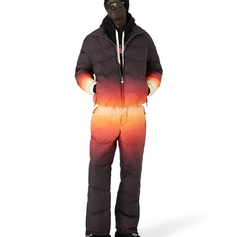 Estos pantalones de esquí presentan un refinado diseño de Apras-Sport confeccionado en tejido de plumón con estampado degradado, con un degradado multicolor inspirado en el espectacular resplandor alpino que ilumina los paisajes montañosos de Japón. Evocan la mágica transición cuando los tonos rosados y púrpuras se extienden por los picos nevados y los valles rurales resplandecen con la última luz del día. Se completan con cierre elástico en la parte delantera, bolsillos laterales con cierre de cremallera y bolsillos traseros adornados con herrajes plateados, además de cierre de cremallera en los tobillos.