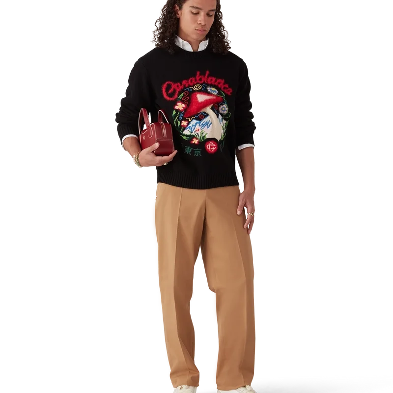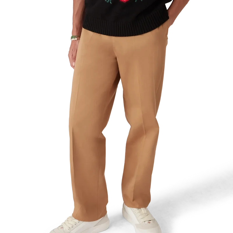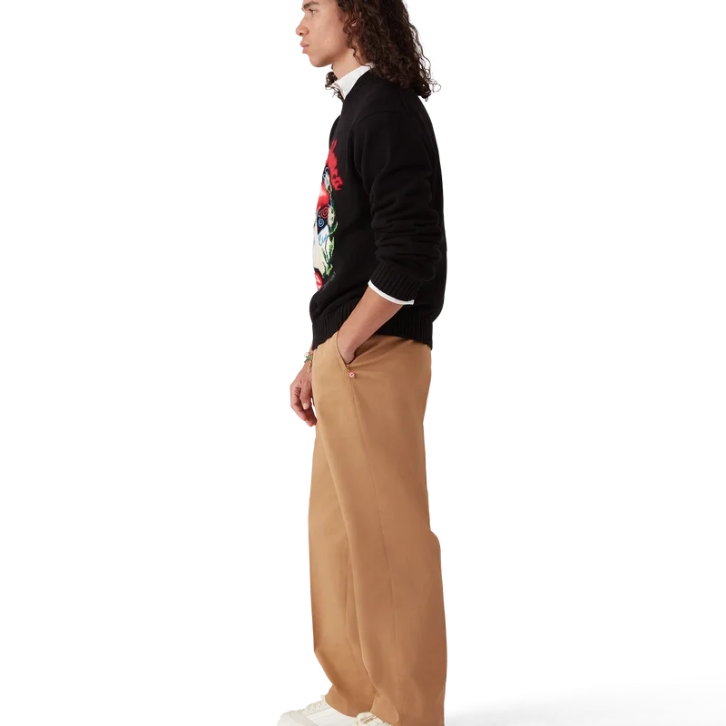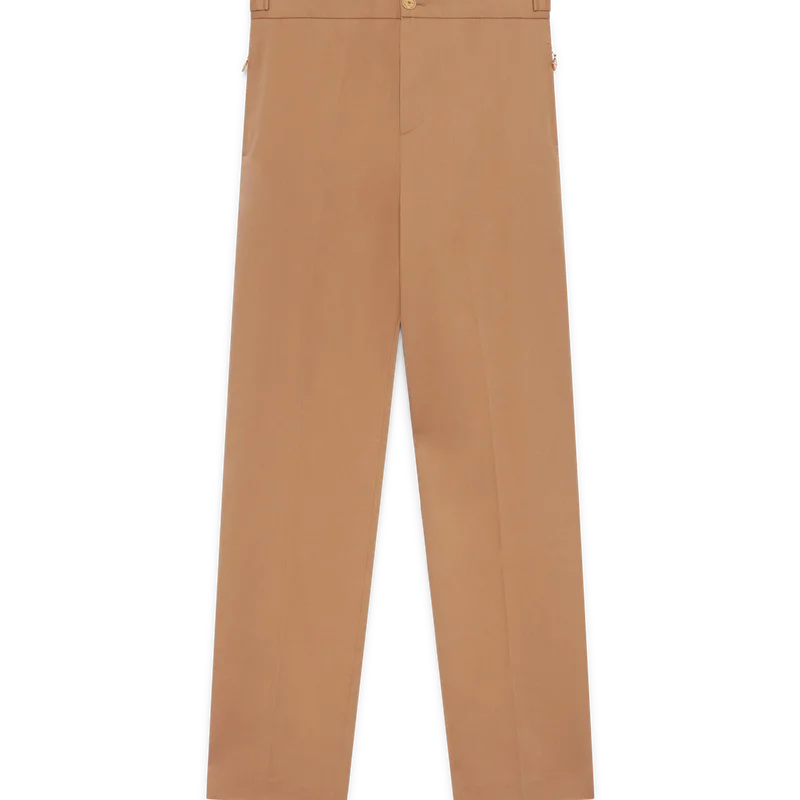 Los pantalones chinos tienen un diseño de pierna recta confeccionado en tejido de algodón orgánico. Cuentan con forro de algodón, bolsillos de ojal en las costuras con cierre de cremallera que incluyen las lengüetas con el logotipo de diamante característico de la casa, cierre de cremallera, ajustadores laterales y bolsillos traseros de ojal.