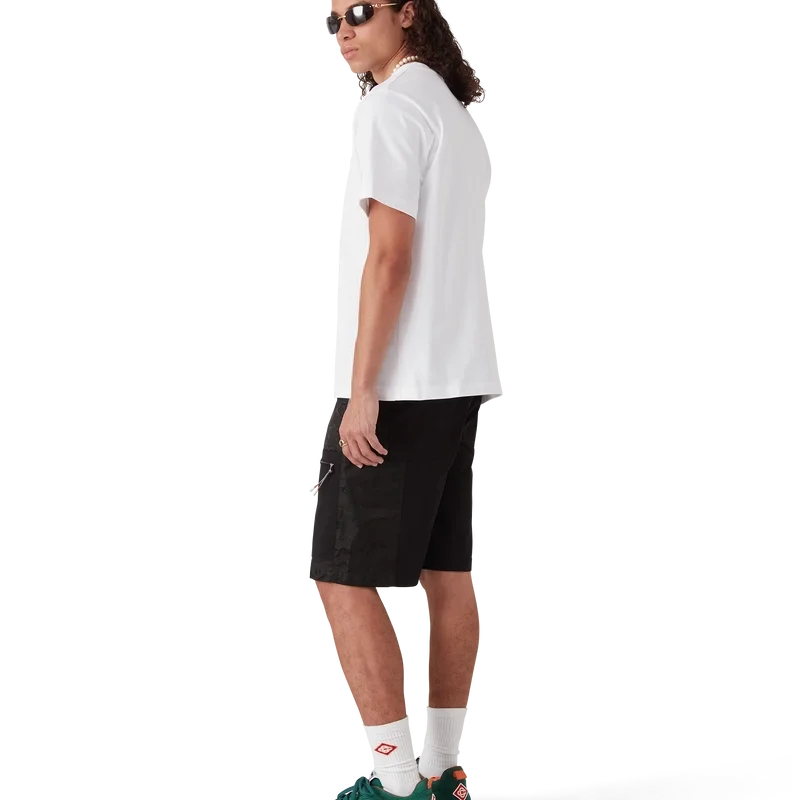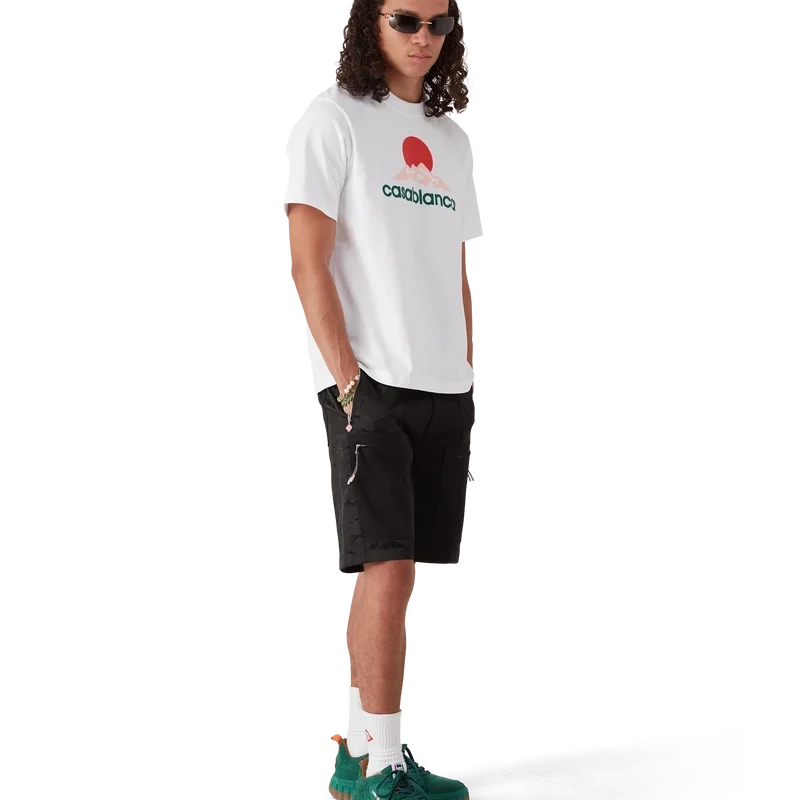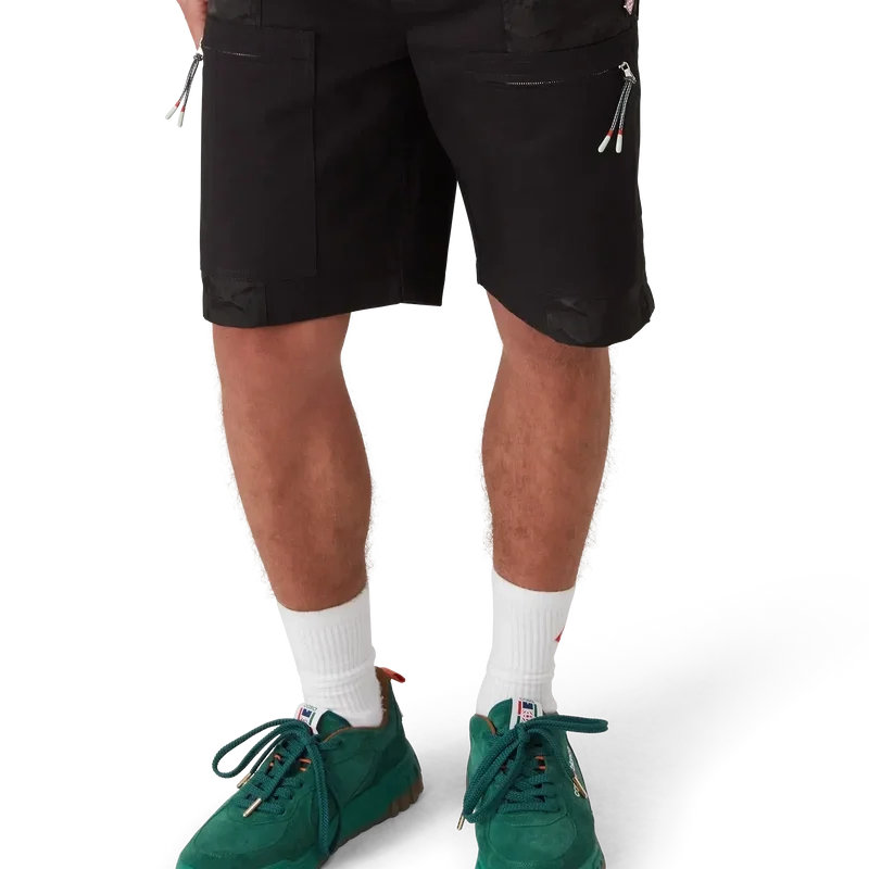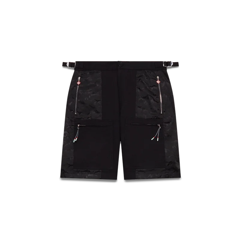Los pantalones cortos cargo de nylon con estampado de camuflaje de montaña tienen un diseño hasta la rodilla confeccionado en tejido de nylon y algodón jacquard. Se completan con bolsillos de parche inclinados con cremalleras verticales y tiradores con el logotipo de diamante característico de la casa, forro, bolsillos de parche en los muslos con cierre de cremallera y tiradores inspirados en cuerdas de montañismo, bolsillos de parche traseros, cierre de cremallera y ajustadores laterales.