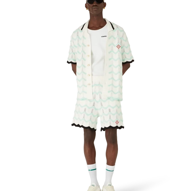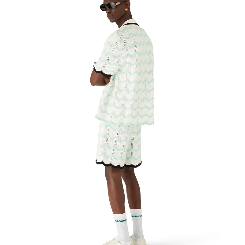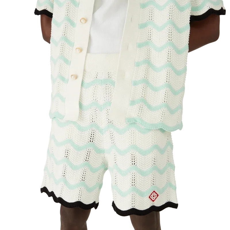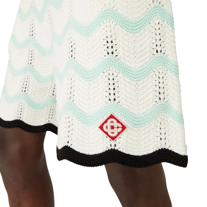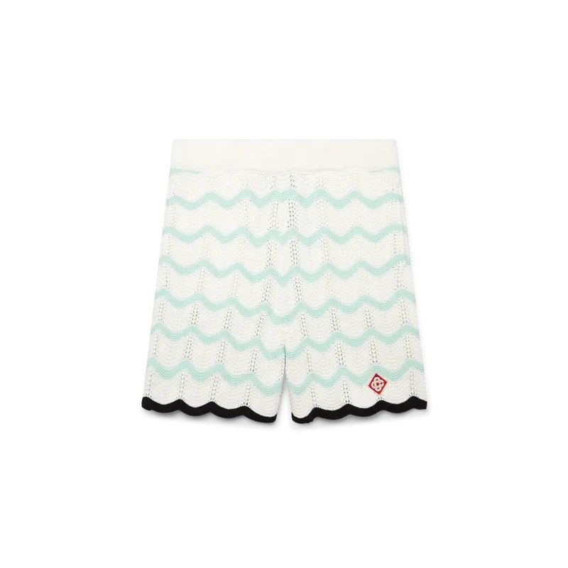 Los pantalones cortos de algodón de ganchillo con diseño ondulado degradado presentan un diseño de punto con el logotipo de diamante característico de la casa. Cuentan con una cintura acanalada en contraste negro, cierre con cordón, bolsillos laterales en las costuras y detalles de bordes ondulados en el dobladillo.