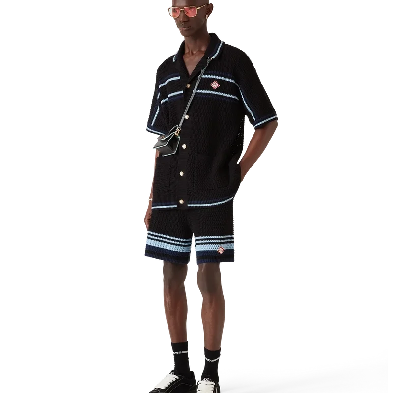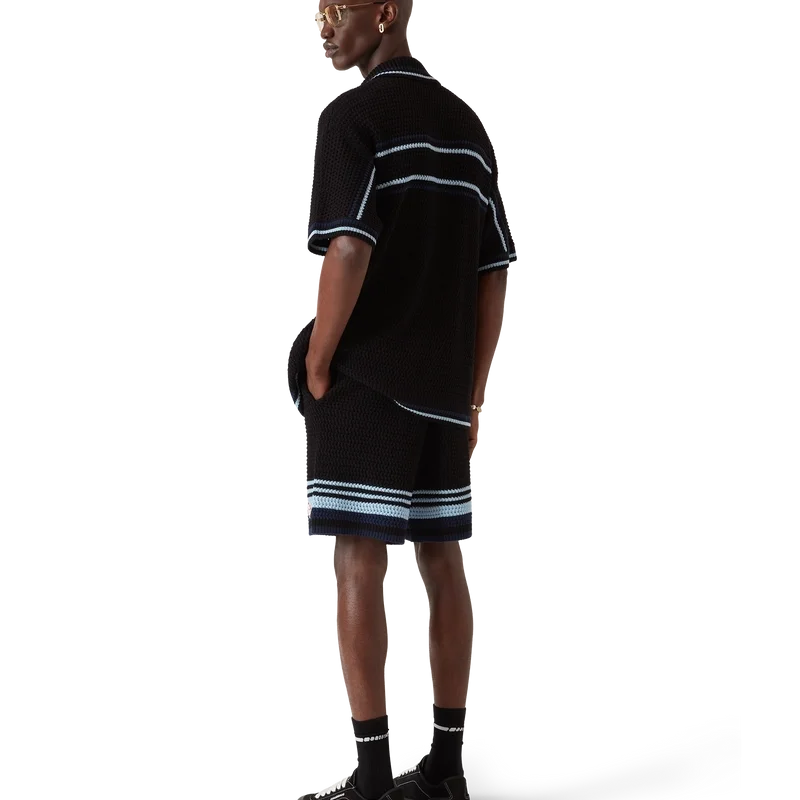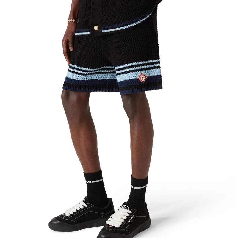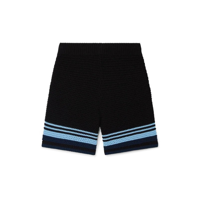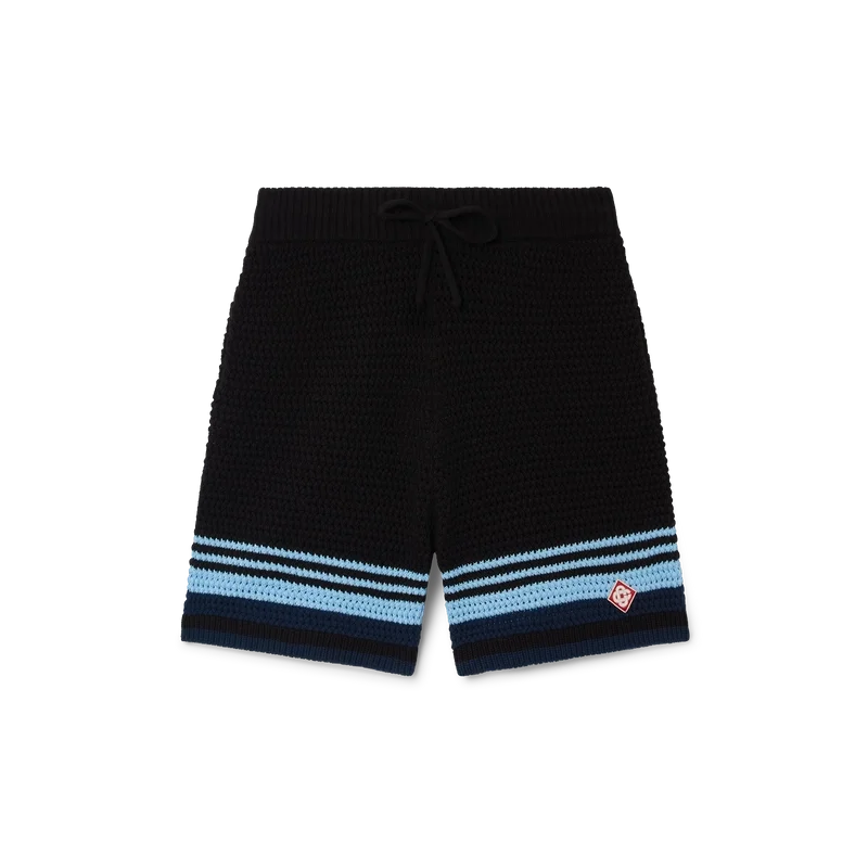 Los pantalones cortos de croché presentan un diseño refinado de textura suave, con el logotipo de diamante característico de la casa. Acabados con una cintura elástica acanalada con cierre de cordón, bolsillos laterales, detalle de rayas en contraste en las piernas y una silueta relajada.