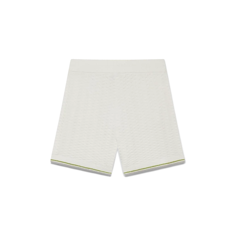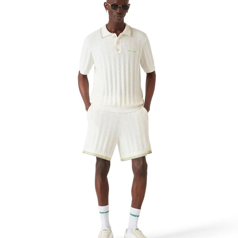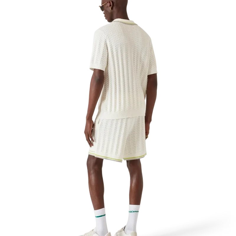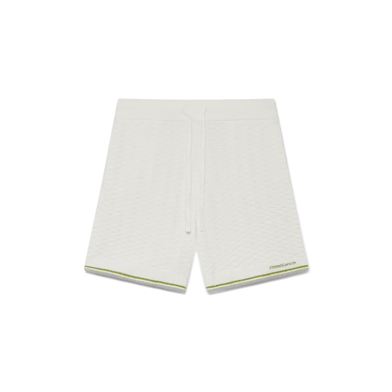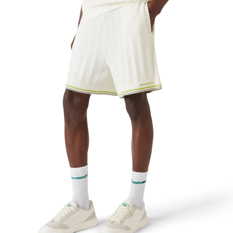 Los pantalones cortos de bouclé de tenis presentan un diseño texturizado con el logotipo Casablanca de la casa. Se completan con el logotipo Casablanca característico de la casa, una cintura elástica, cierre con cordón y dobladillo acanalado con detalle de borde rayado.
