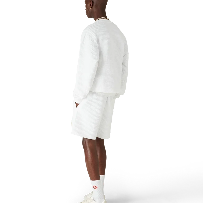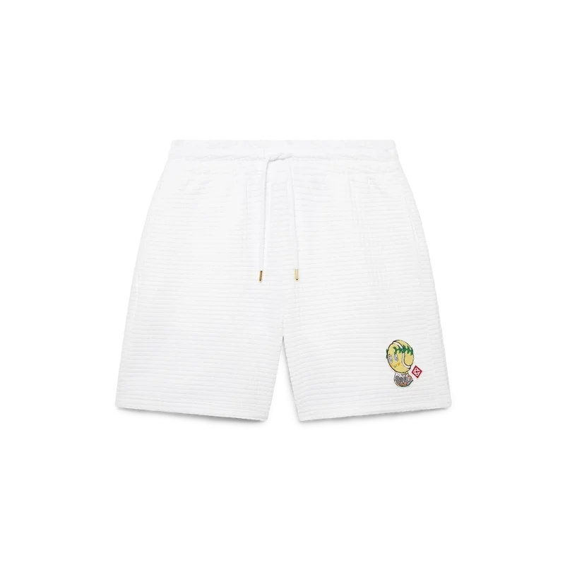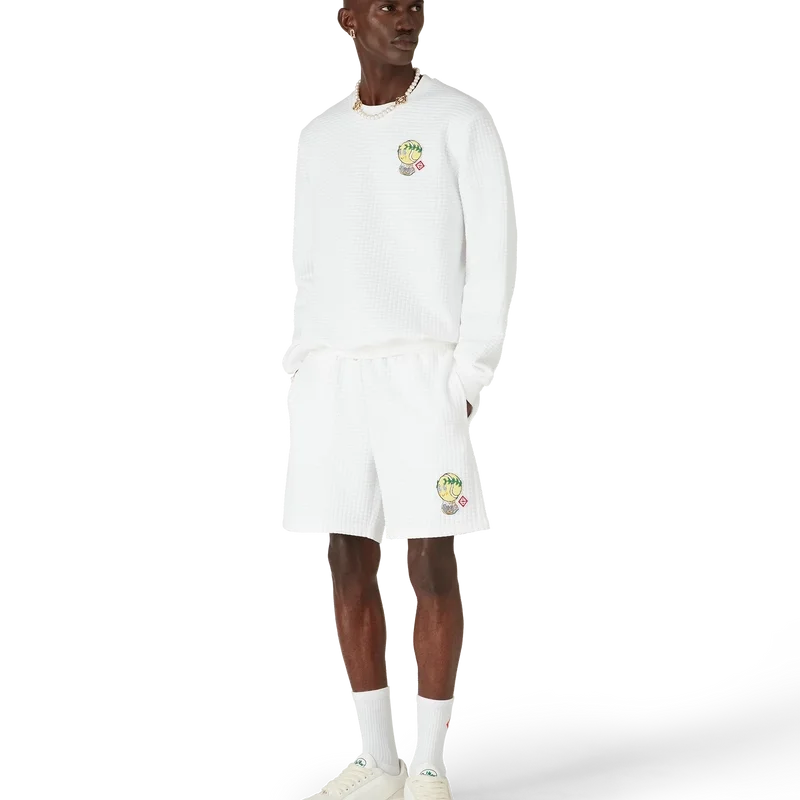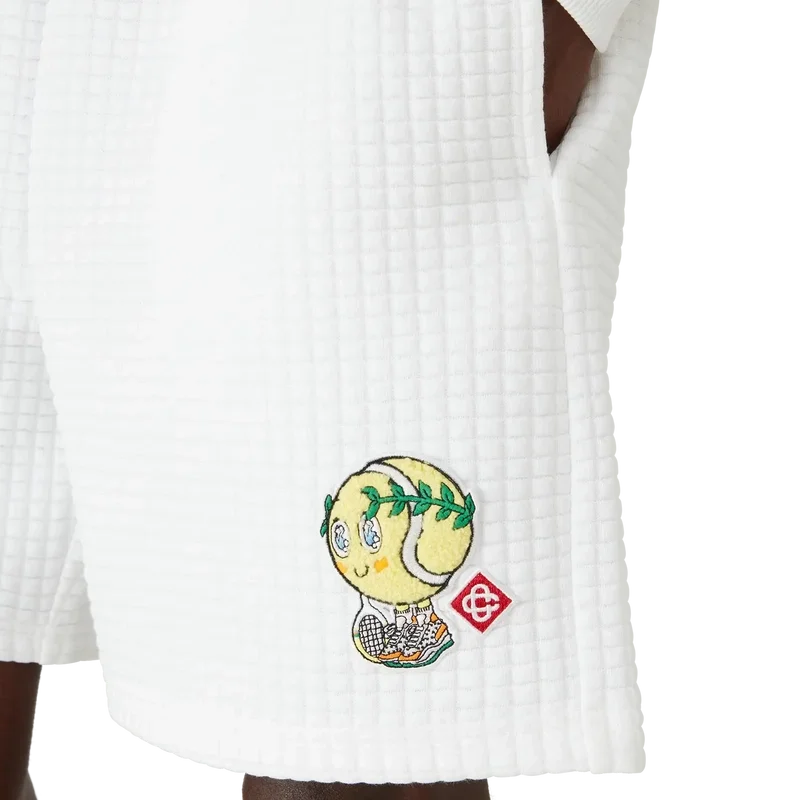 Los pantalones cortos acolchados Tennis Mascot presentan un diseño bordado, confeccionados con un tejido acolchado con patrón de cuadrícula que incluye ilustraciones de temporada de la pelota de tenis kawaii; este personaje es una parte fundamental de nuestro universo. Incorpora elementos como la hoja de laurel, la zapatilla Atlantis, la raqueta y los ojos kawaii. Hemos elegido a este personaje como motivo central de todos los modelos para hombre de la colección. Cuentan con cintura elástica, cierre con cordón, bolsillos en las costuras y un bolsillo trasero de parche Anda.