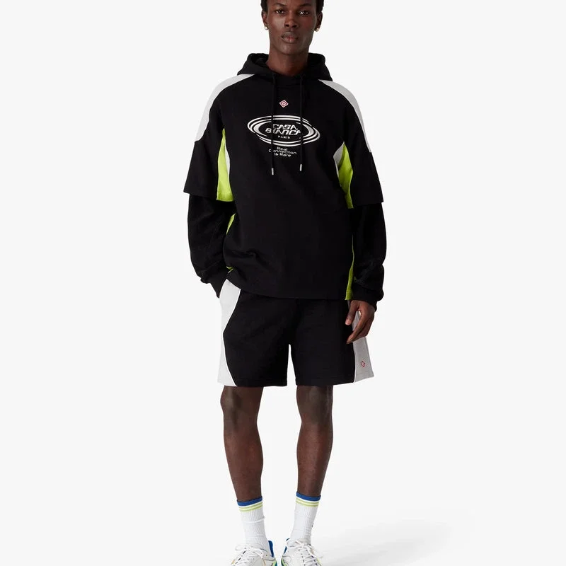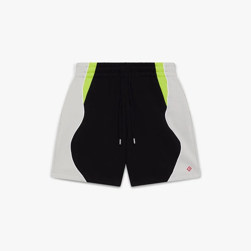Los pantalones cortos de chándal con bloques de color en negro y gris presentan un diseño deportivo refinado, con un diseño de bloques de color y el logotipo del diamante característico de la casa. Se completan con una cintura elástica, cordón de ajuste con puntas doradas, ribetes en contraste y bolsillos laterales en la costura.