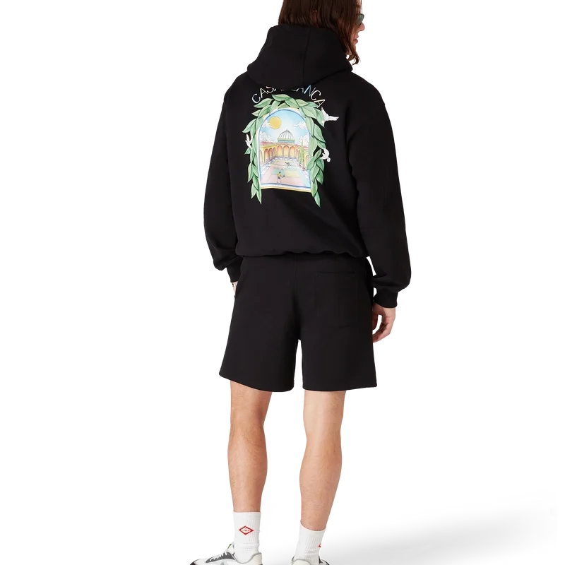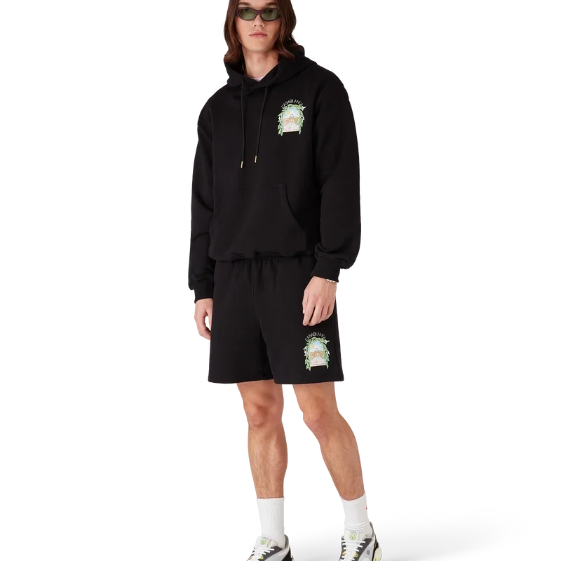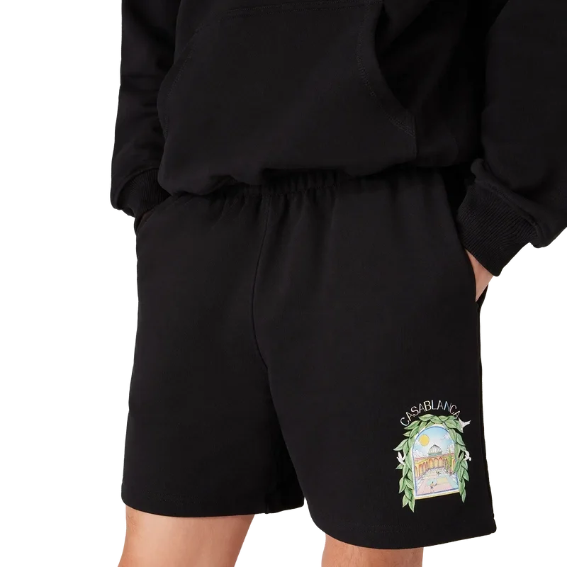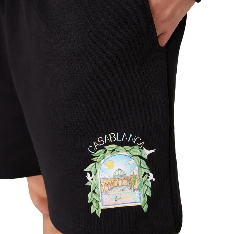 Los pantalones cortos de chándal L’arche presentan un diseño estampado refinado con la obra de arte de temporada de la casa y elementos de diseño inspirados en el arco, la naturaleza, la arquitectura y el tenis. Cuentan con cintura elástica, cordón de ajuste con puntas doradas, bolsillos laterales y un bolsillo de parche en la parte trasera.