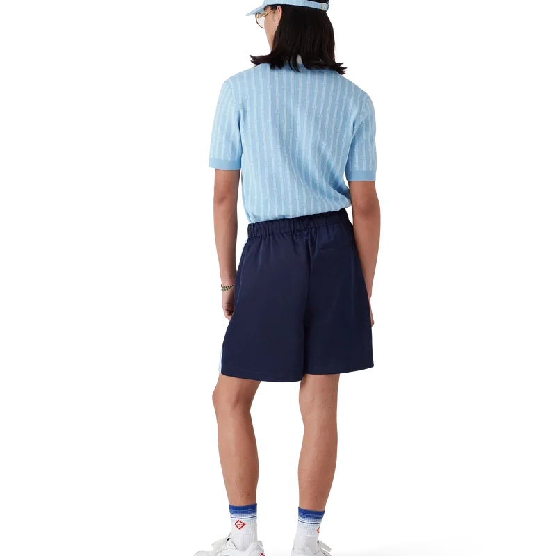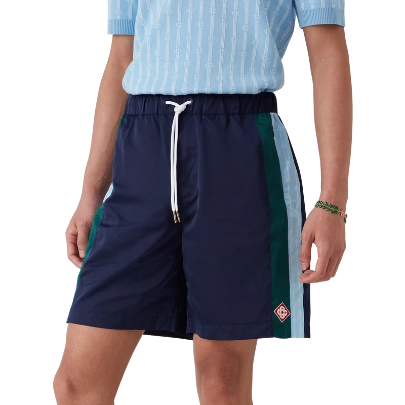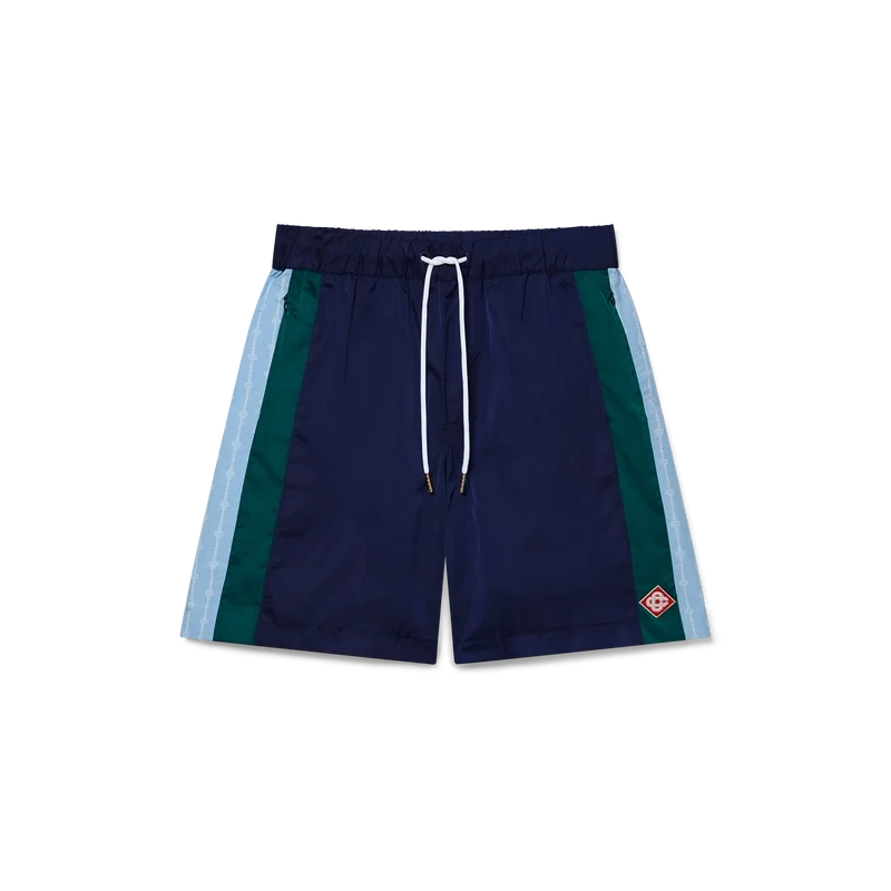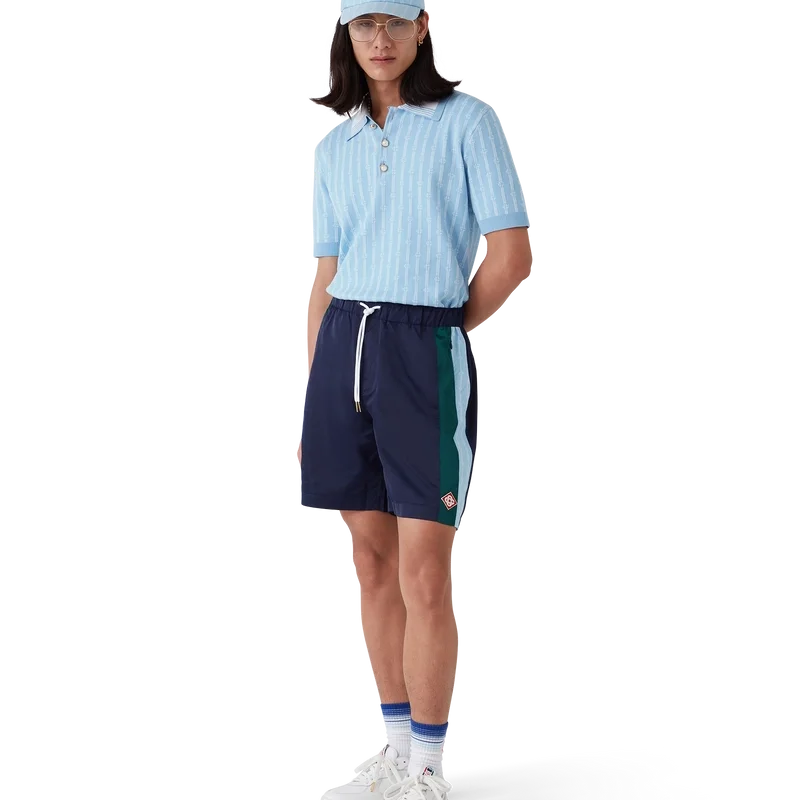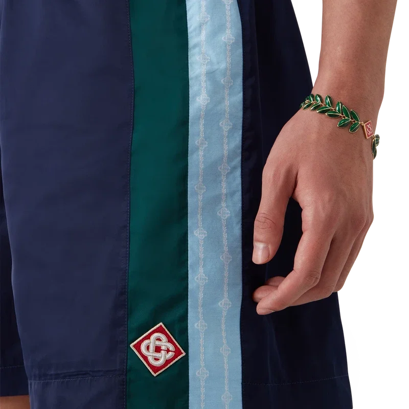 Los pantalones cortos de chándal Laurel Stripe son un diseño de largo medio confeccionado en tejido técnico con el logotipo de diamante característico de la casa. Se completan con una cintura elástica, cordón de ajuste con puntas doradas, bolsillos laterales en la costura con cierre de cremallera, detalle de rayas en los laterales y un bolsillo trasero ribeteado con cierre de cremallera.