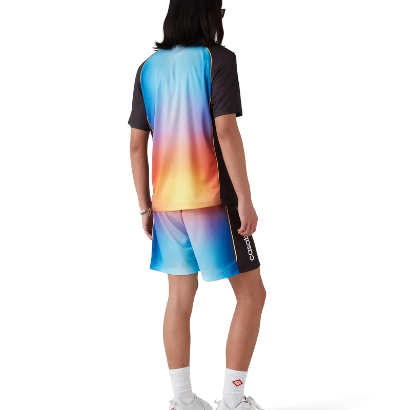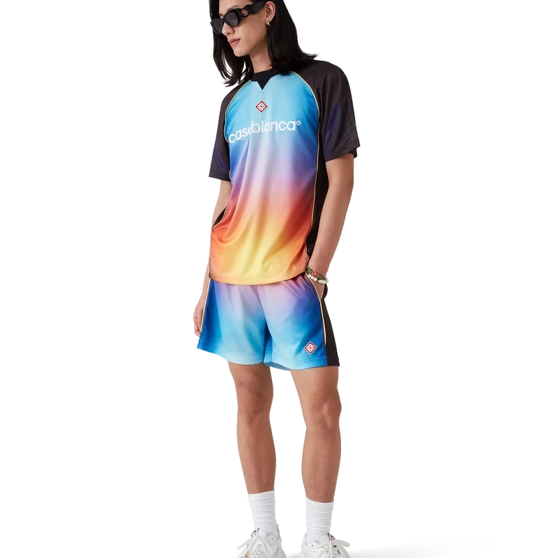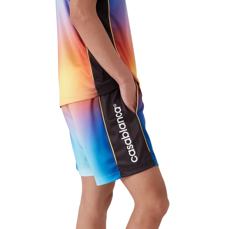 Los pantalones cortos de fútbol Gradient son un diseño deportivo confeccionado con un tejido estampado degradado que incorpora el logotipo Casablanca característico de la marca en el lateral. Se completan con una cintura elástica con cordón de ajuste y bolsillos laterales en las costuras.