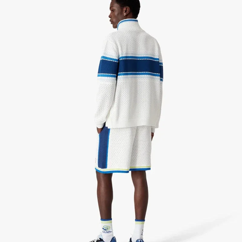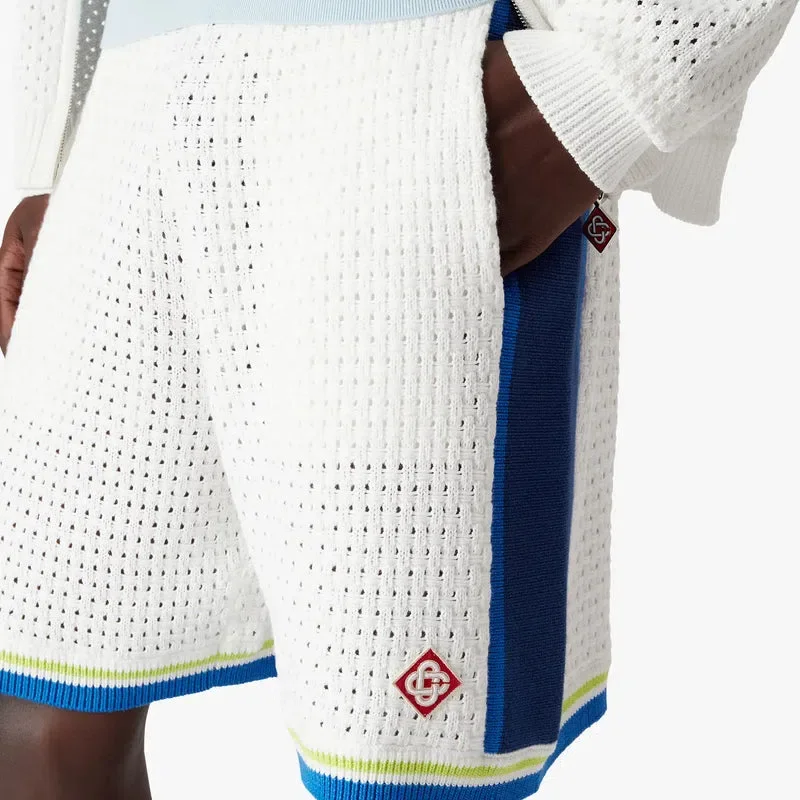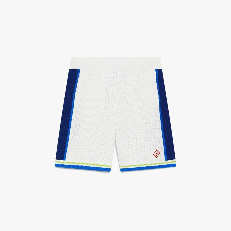 Los pantalones cortos de croché blancos y azules presentan un diseño refinado confeccionado con un tejido de trama abierta y detalles de rayas en los laterales. Cuentan con una cintura elástica, cierre con cordón, bolsillos laterales en las costuras y detalles de bordes a rayas en las perneras.