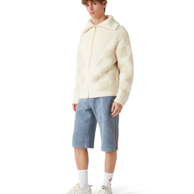 Los pantalones cortos de jean Monogram son un diseño de largo medio confeccionado en tela de denim Monogram con el monograma característico de la casa. Cuentan con bolsillos delanteros y traseros, presillas para cinturón de piel de cordero, ribetes de piel en los laterales y en los bolsillos, y cierre de napa y herrajes dorados. Diseñados para llevarse con su chaqueta a juego.