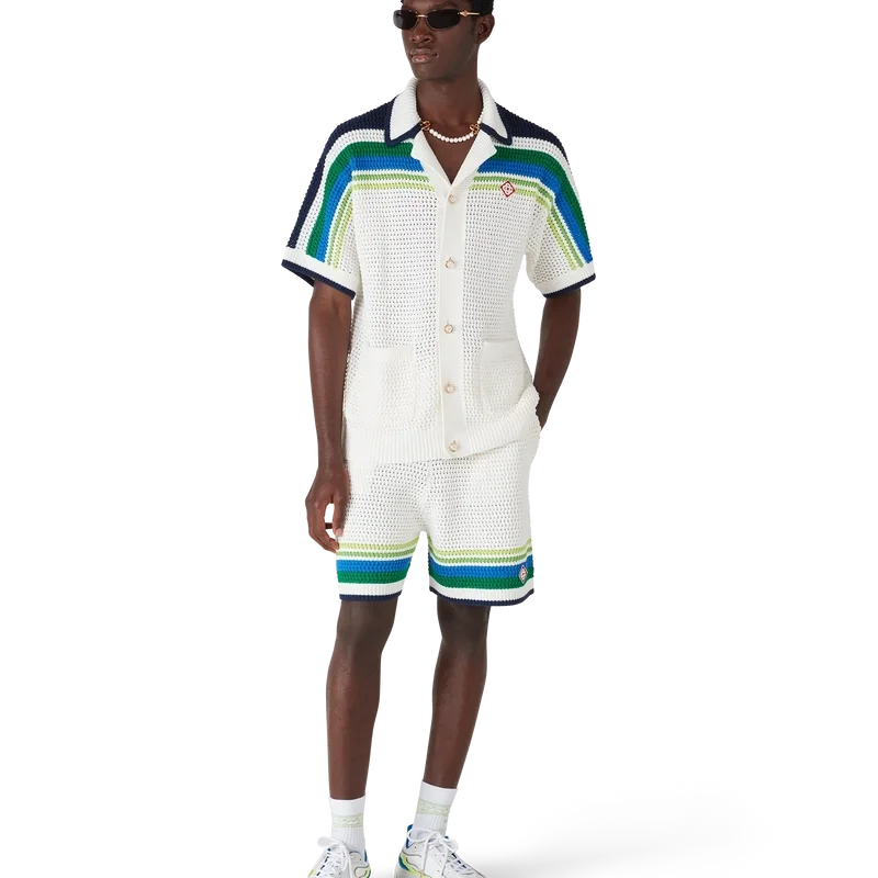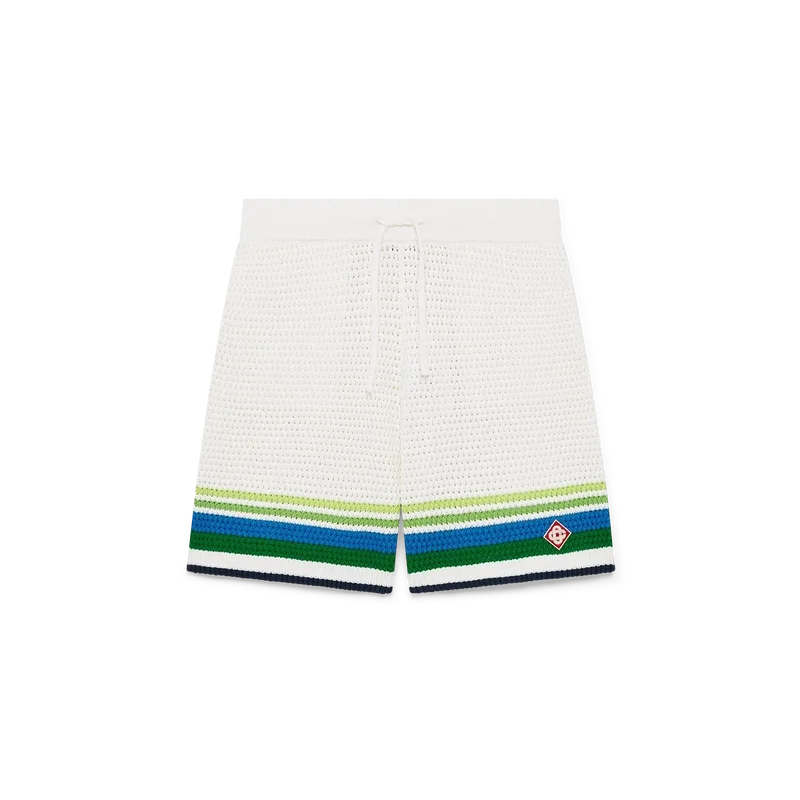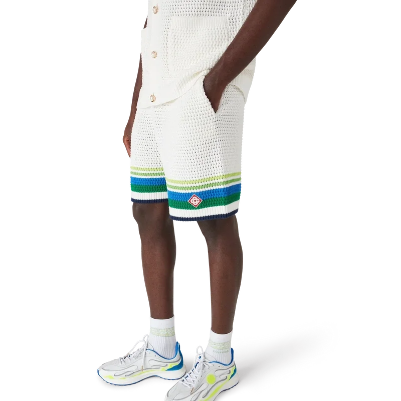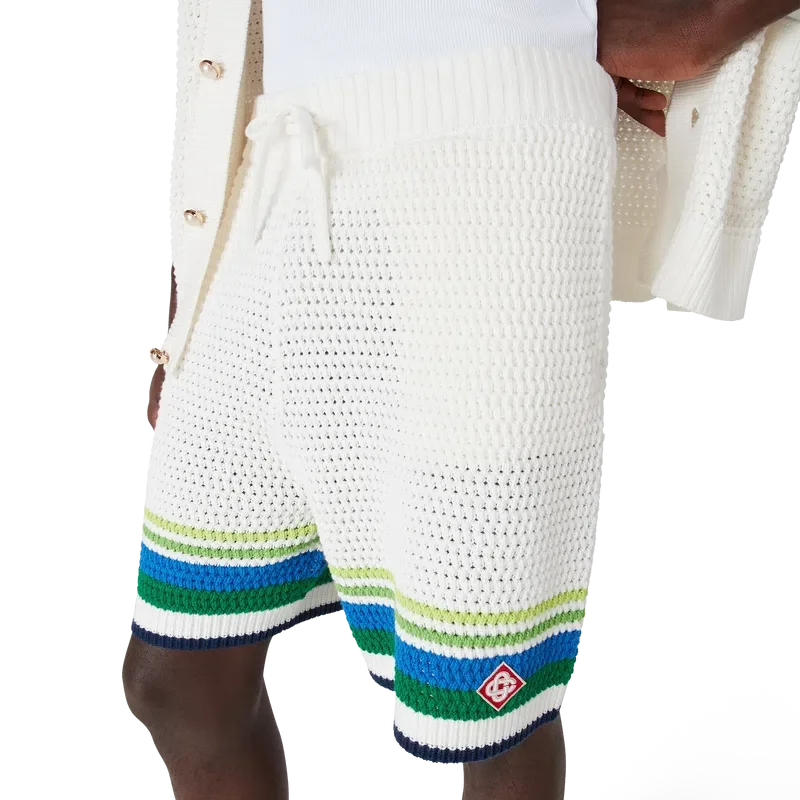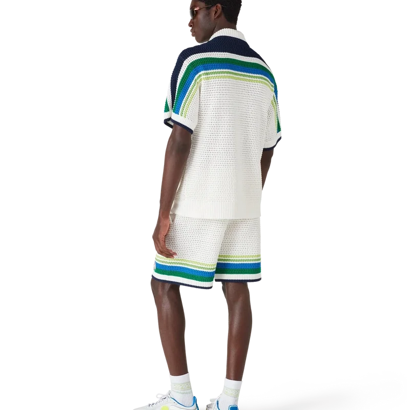 Los pantalones cortos de punto a rayas presentan un diseño refinado de textura suave confeccionado en tejido de algodón de ganchillo, con el característico diseño de rayas de tenis en colores naturales. Acabados con una cintura elástica acanalada con cierre de cordón, bolsillos laterales y una silueta holgada.