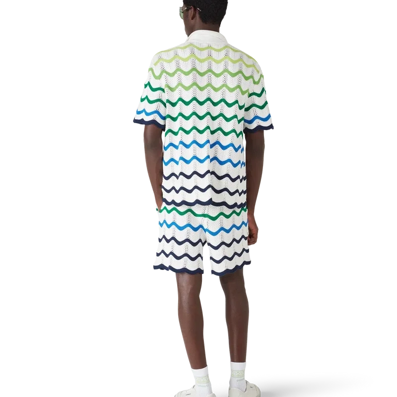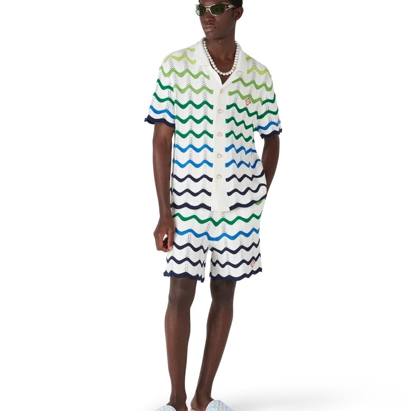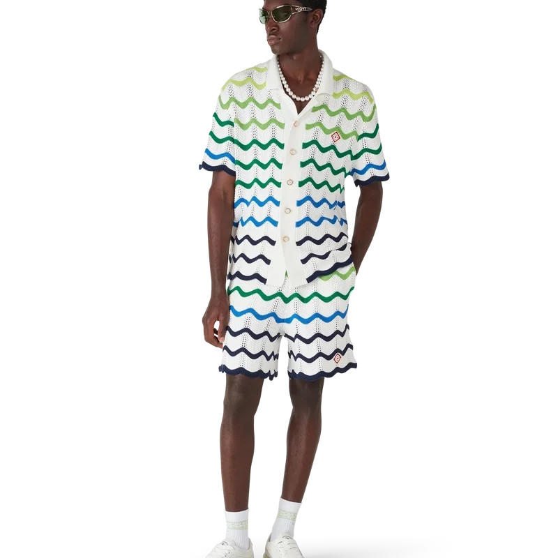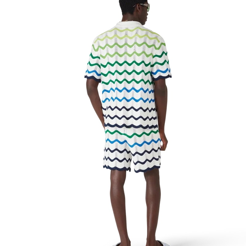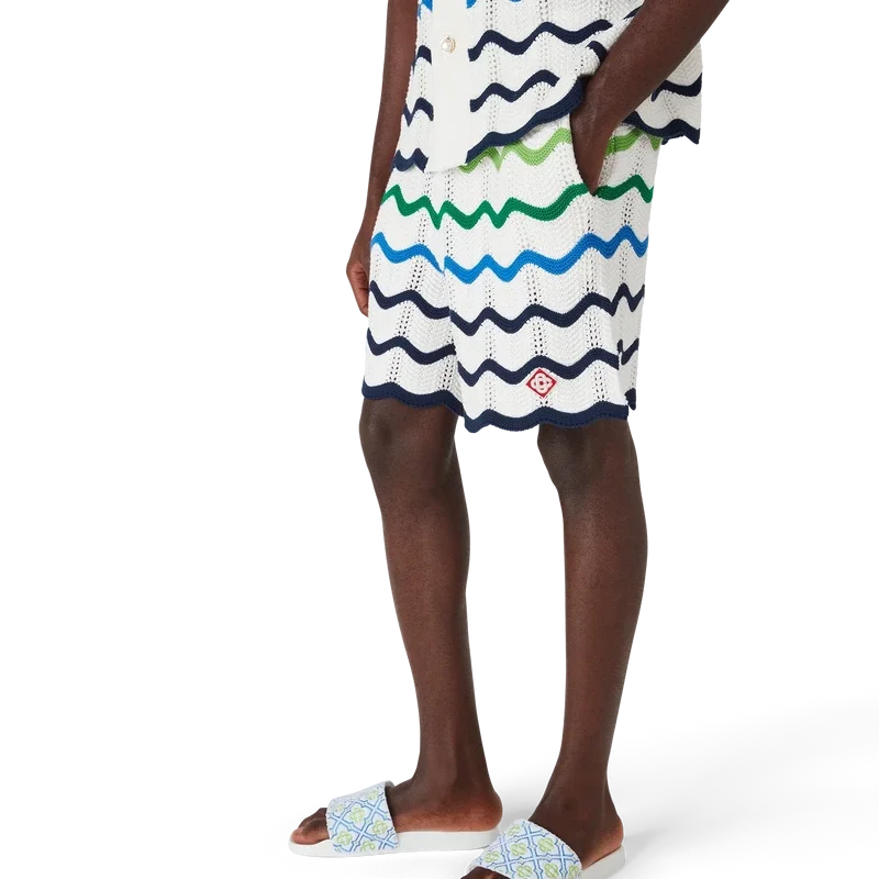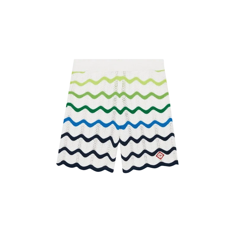 Los pantalones cortos de punto Wave presentan un diseño refinado confeccionado en tejido de algodón de ganchillo de trama abierta con el degradado de punto de la temporada. Se completan con una cintura elástica, cierre con cordón, bolsillos laterales, el logotipo del diamante característico de la casa y una silueta holgada.