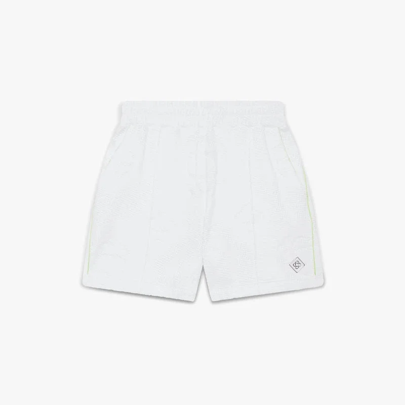 Los pantalones cortos blancos de rizo con Monogram presentan un diseño refinado, con el icónico estampado Monogram de la casa en toda la prenda y el logotipo del diamante característico. Se completan con una cintura elástica, cierre con cordón, bolsillos inclinados, un bolsillo trasero de parche y ribetes en contraste a lo largo de los costados y los bolsillos.