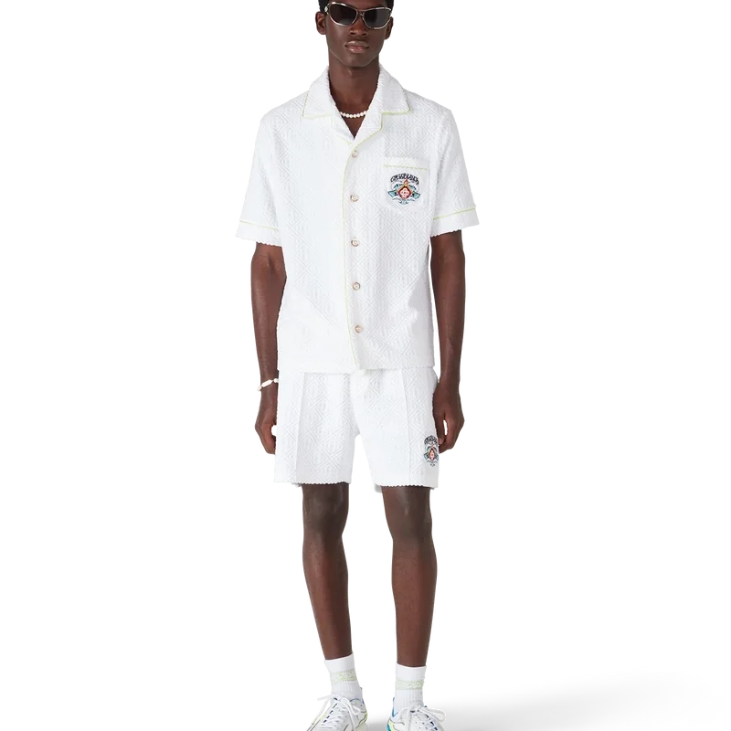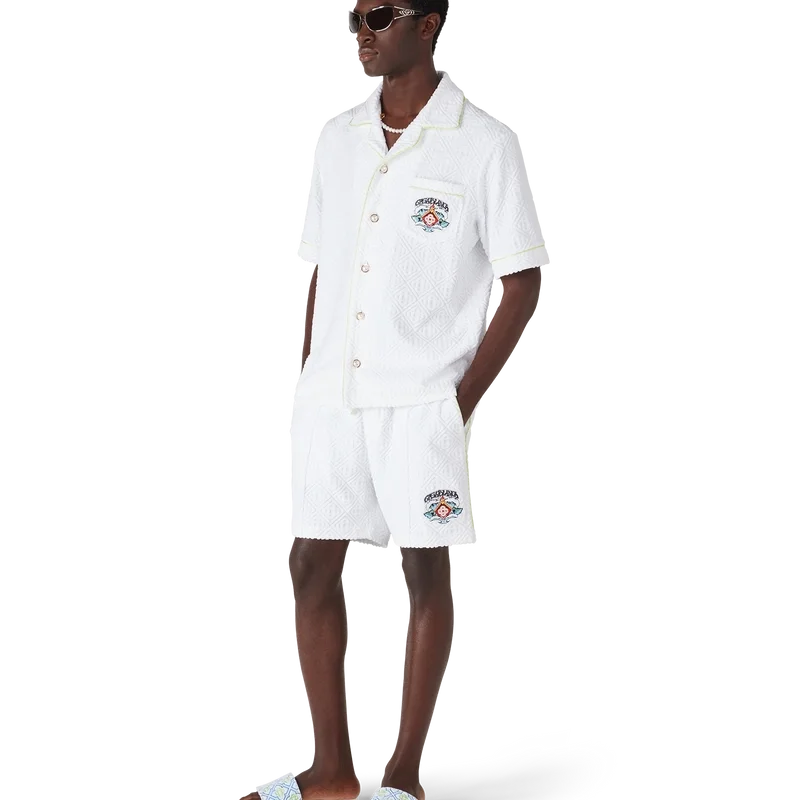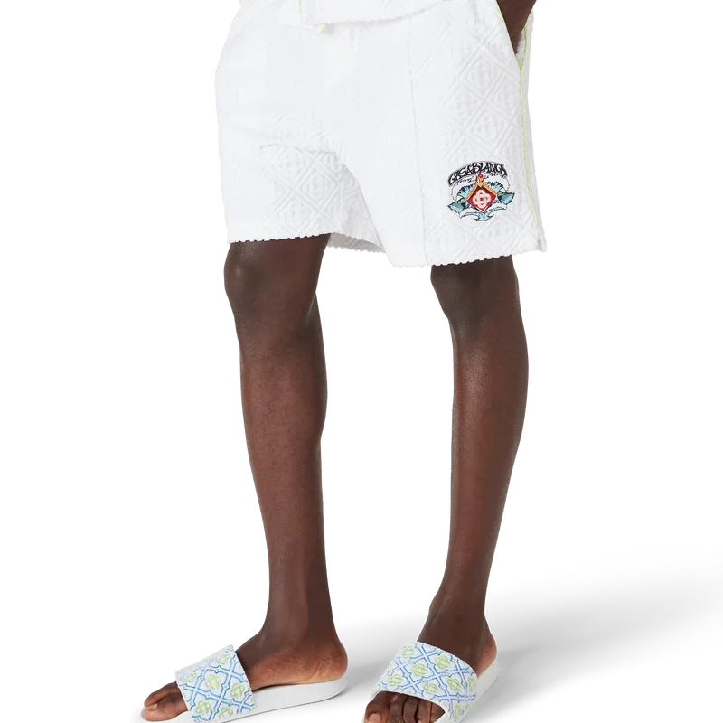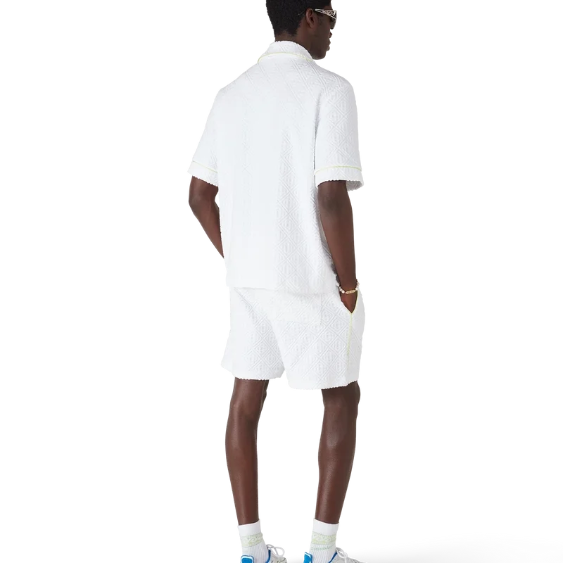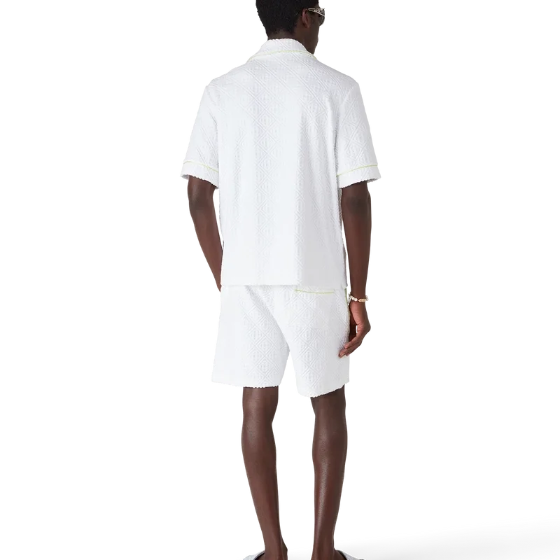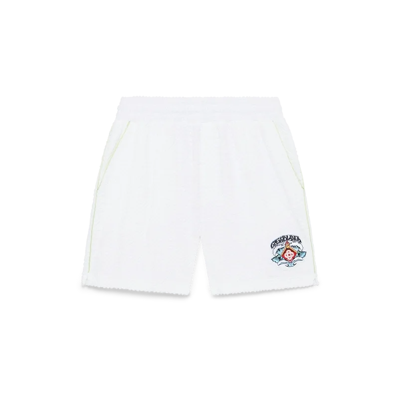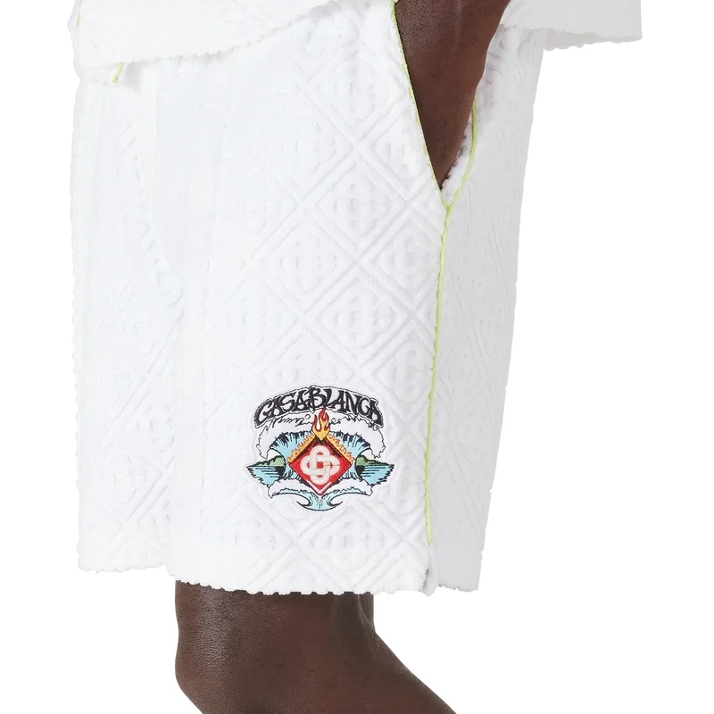 Los pantalones cortos de rizo con monograma presentan el diseño de la temporada: una formación simétrica de olas rompiendo sobre el emblemático logotipo de diamante de la casa, rodeado de llamas. Se completan con una cintura elástica, cierre con cordón, bolsillos laterales inclinados, un bolsillo trasero de parche, costuras plisadas y detalles de ribete a lo largo de los bolsillos y por los laterales.