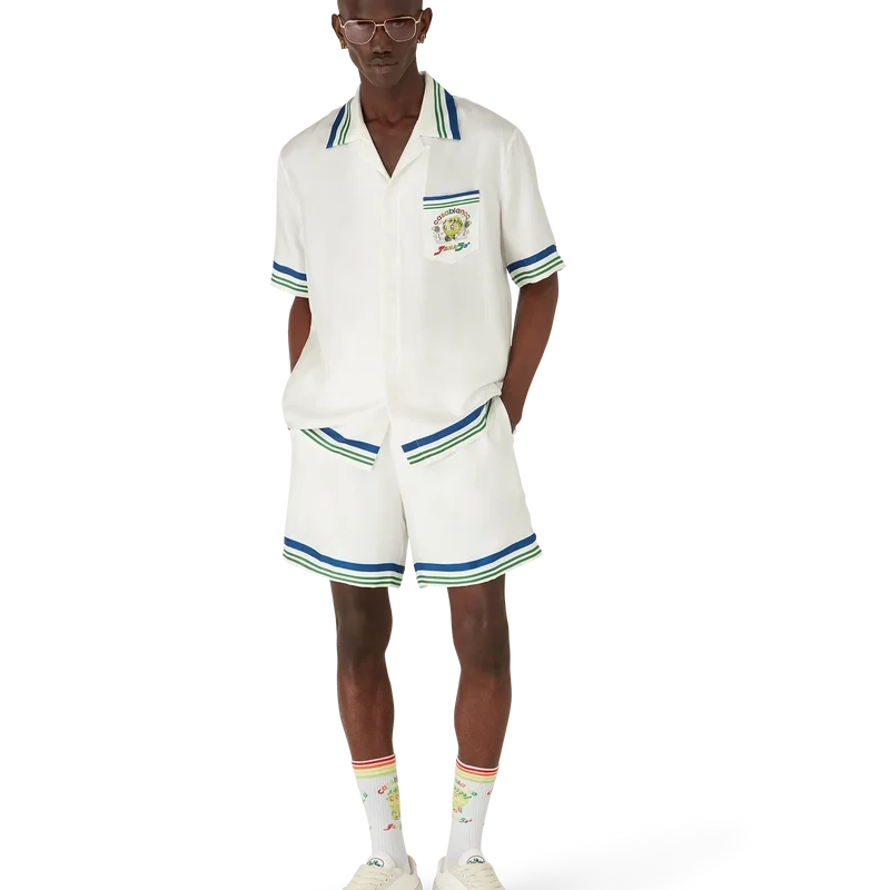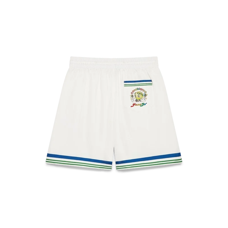 Los pantalones cortos de sarga de seda Tennis Club Icon presentan un diseño estampado con el motivo de temporada de la pelota de tenis kawaii, un personaje clave de nuestro universo. Incorpora elementos como la hoja de laurel, las zapatillas Atlantis, la raqueta y los ojos kawaii. Hemos elegido a este personaje como motivo central de todos los modelos para hombre de la colección. Cuentan con cintura elástica, cierre con cordón, bolsillos laterales en la costura, un bolsillo trasero de parche y un detalle de rayas azules, blancas y verdes en el borde del bolsillo trasero.