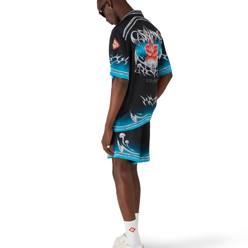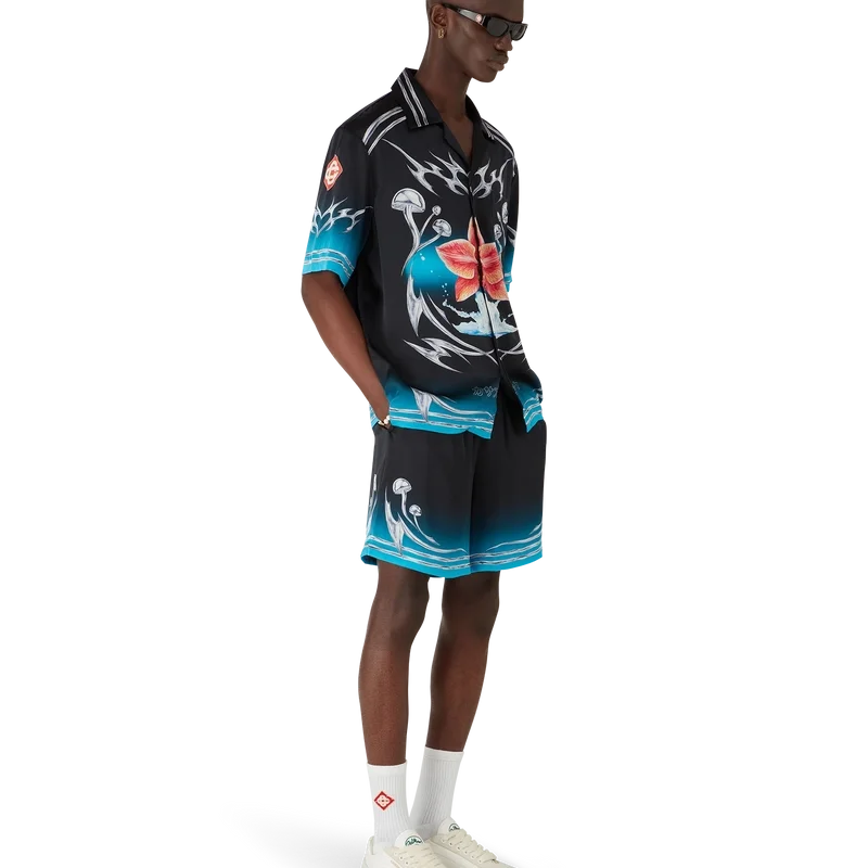 Los pantalones cortos de satén de seda Blades presentan un diseño estampado con ilustraciones que juegan con el contraste entre dos sensaciones opuestas: la nitidez de la hoja y el frío cromo plateado, en contraste con la calidez de la naturaleza, como los tonos rosa y rojo intensos de una flor de orquídea. La incorporación del agua aporta un elemento fresco y nítido al diseño. Se completan con una cintura elástica, cierre con cordón, bolsillos en las costuras y un bolsillo trasero de parche.