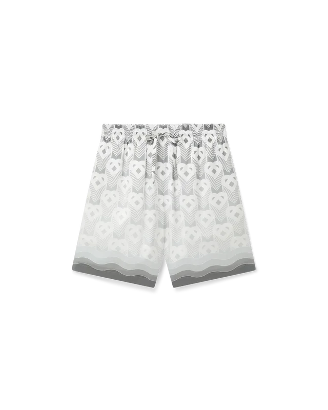 Los pantalones cortos de seda con monograma de corazones degradados presentan un diseño estampado en toda la superficie con el monograma de corazones de la casa sobre el fondo degradado plateado de esta temporada. Confeccionados en tejido de satén de seda con monograma y acabados con cintura elástica, cierre con cordón, bolsillos laterales en las costuras, un bolsillo trasero de parche y detalle en el dobladillo inspirado en la ola de Memphis con degradado.