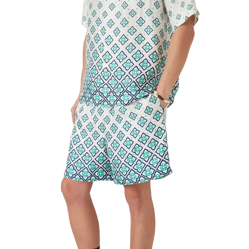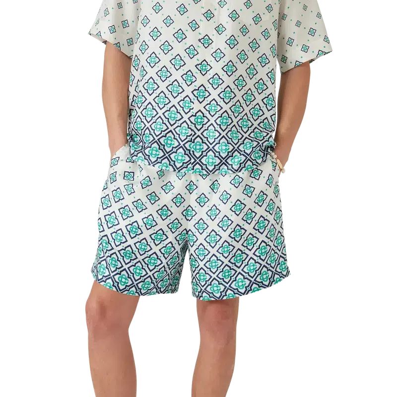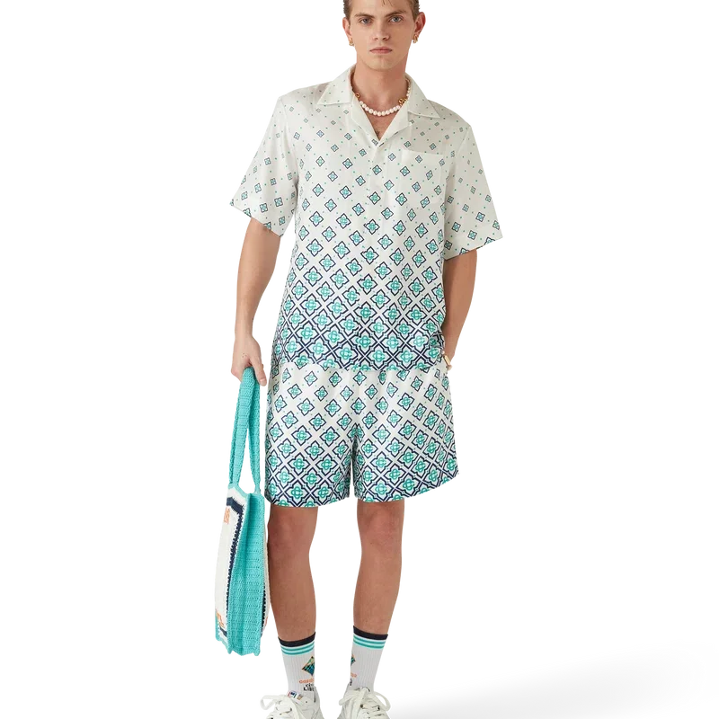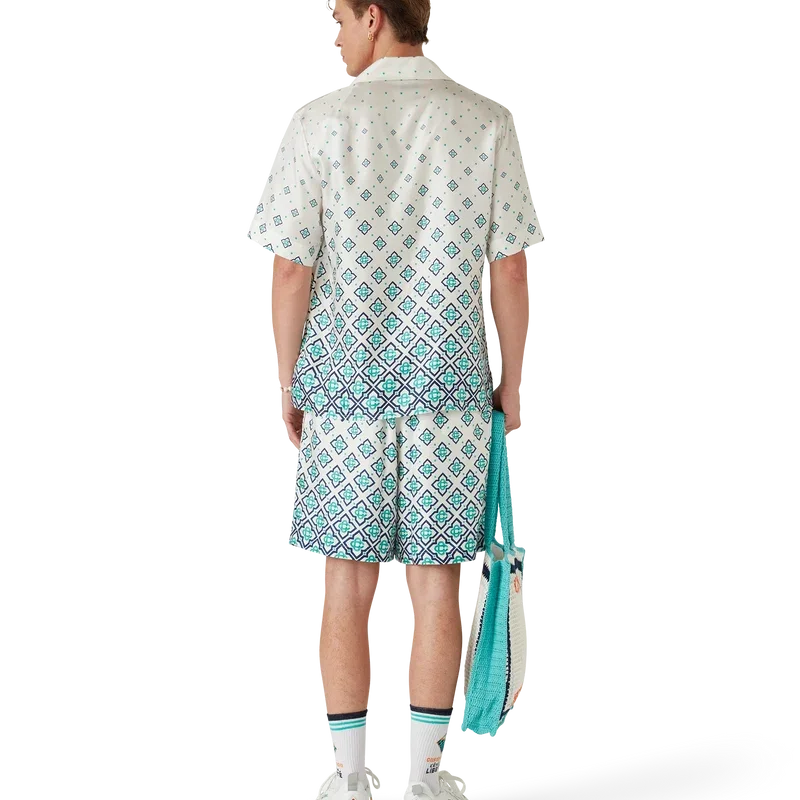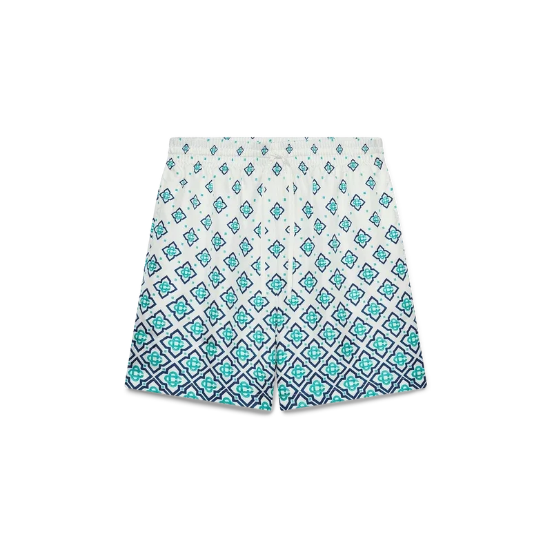 Los pantalones cortos de seda con monograma degradado son un diseño estampado confeccionado en tejido de sarga de seda. Cuentan con una cintura elástica con cordón de ajuste, bolsillos laterales en las costuras, forro y un bolsillo trasero de parche.