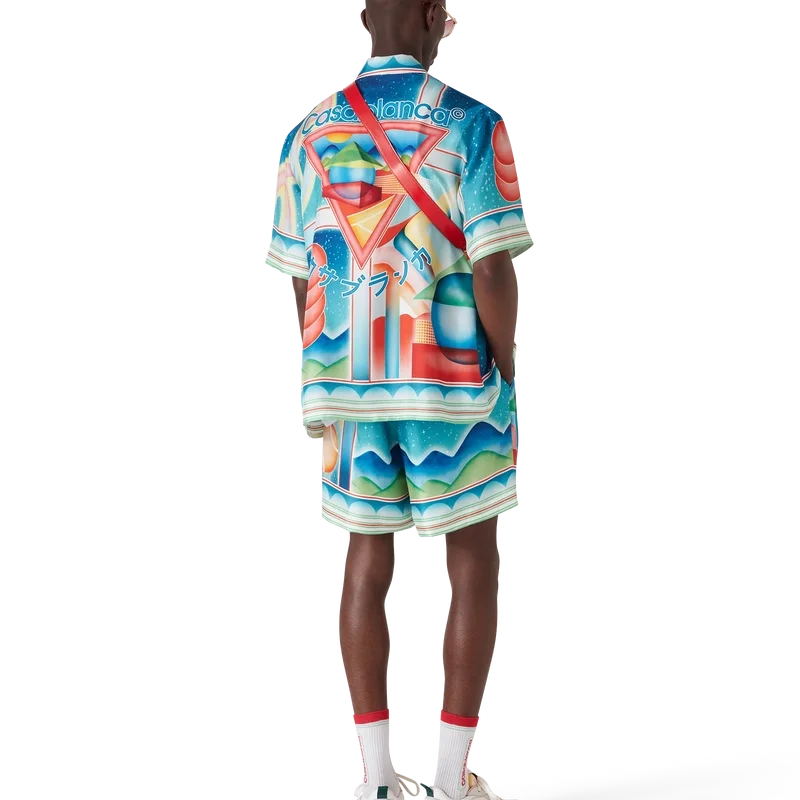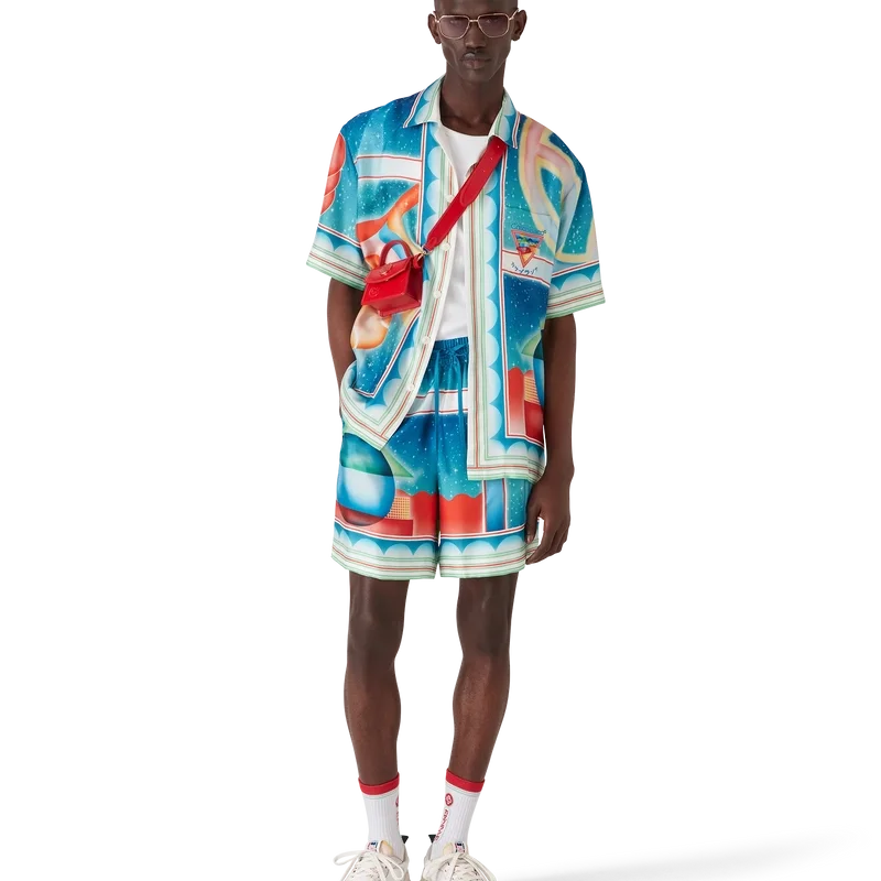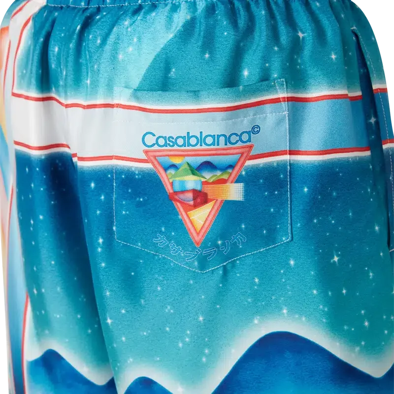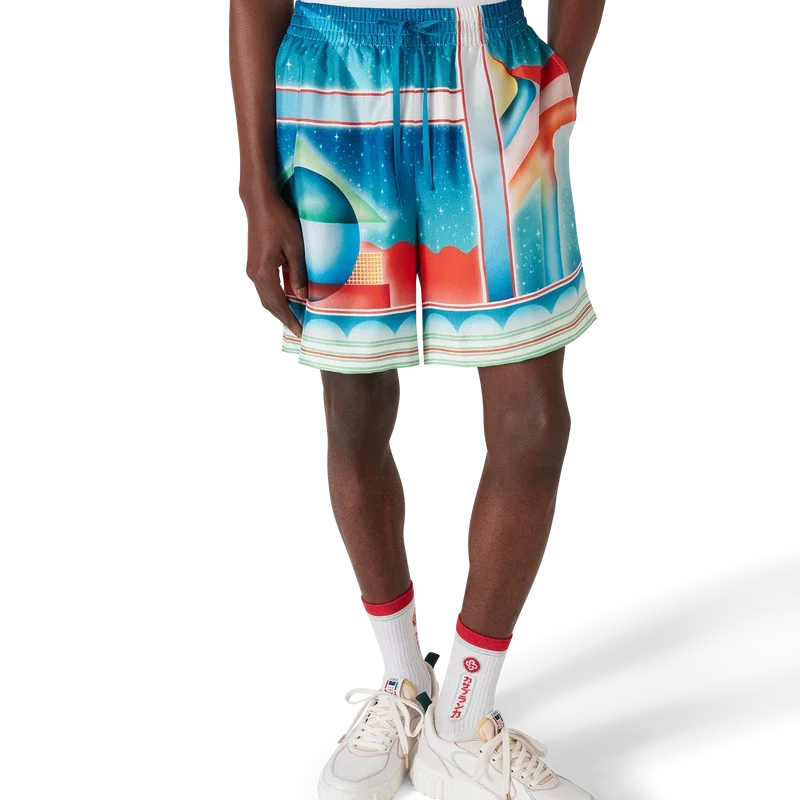Los pantalones cortos de seda Galaxy Court presentan un diseño estampado en toda la superficie y están confeccionados en tejido de sarga de seda. Cuentan con cintura elástica, cierre con cordón, forro, bolsillos laterales en las costuras y un bolsillo trasero.