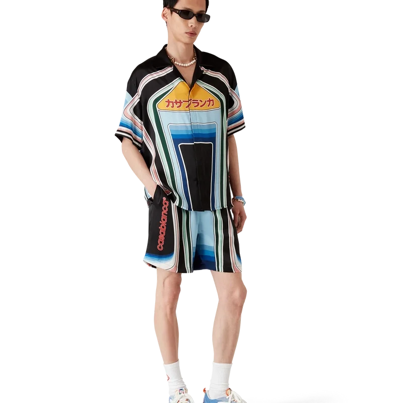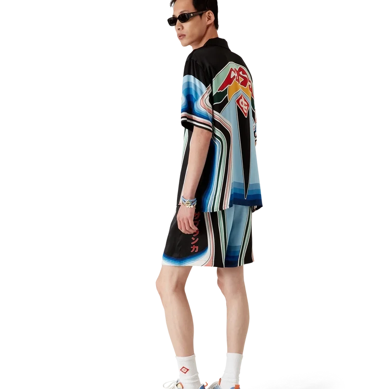Los pantalones cortos de seda Graphic Mountain presentan un diseño estampado en toda la superficie y están confeccionados en tejido de satén de seda. Cuentan con una cintura elástica, cierre con cordón, bolsillos laterales en las costuras y un bolsillo trasero.