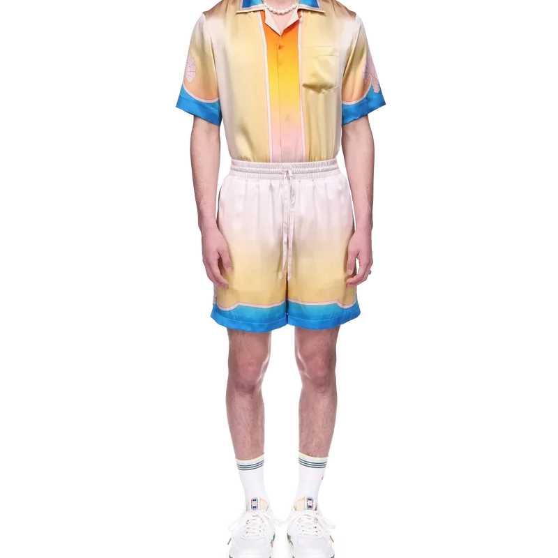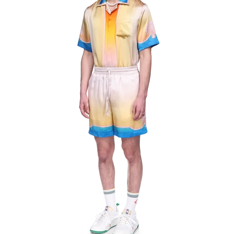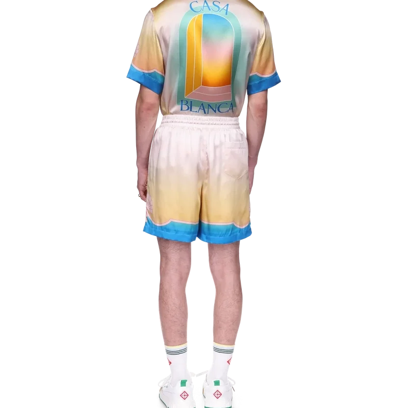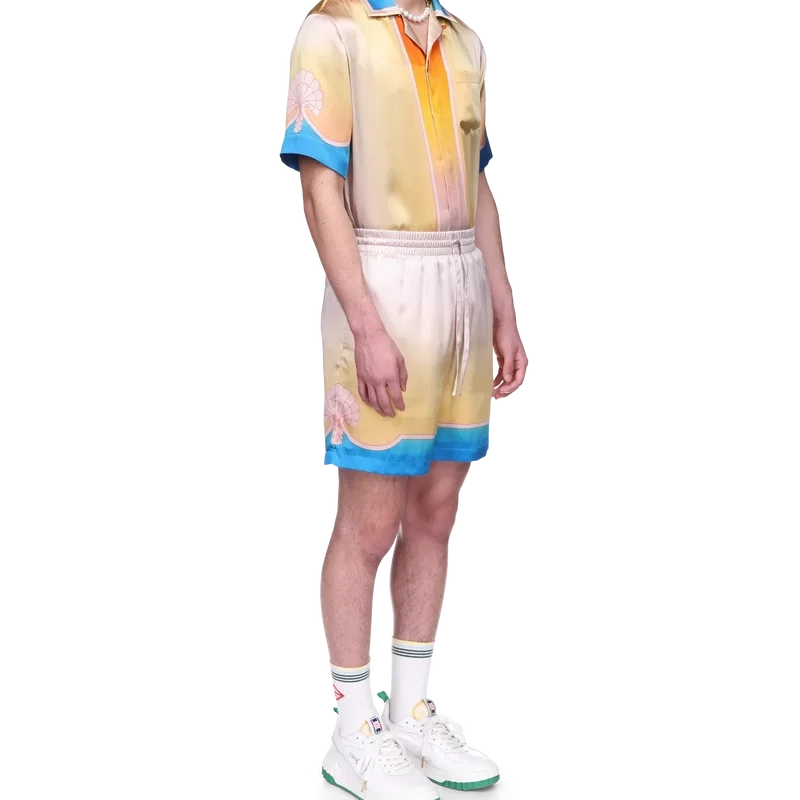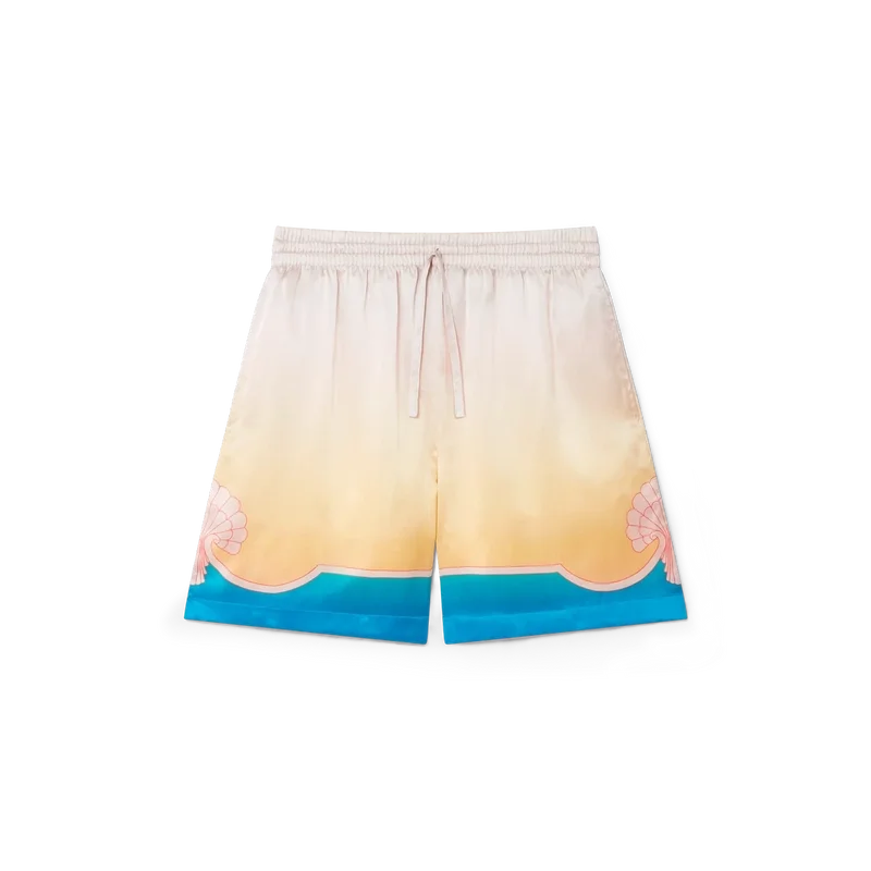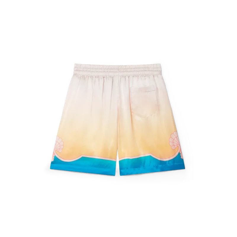 Los pantalones cortos de seda L’arc Colora presentan un diseño familiar confeccionado en tejido de satén de seda estampado y cuentan con el estampado degradado y el motivo de conchas característicos de la casa. La paleta de colores de esta colección es ligera e idealista, y enfatiza los temas etéreos que son el núcleo de nuestra marca. Se completan con detalles de rayas en los bordes que forman motivos de conchas en el dobladillo, una cintura elástica con cierre de cordón, bolsillos laterales y un bolsillo trasero.