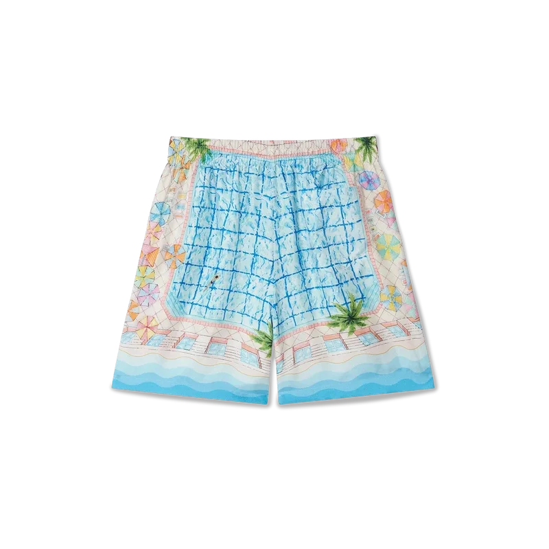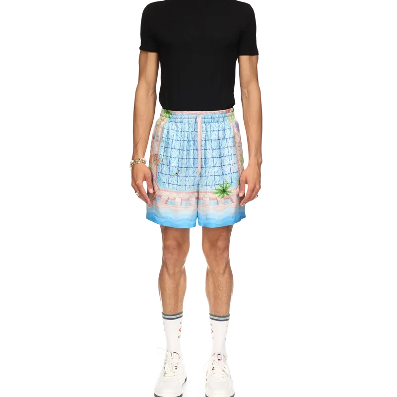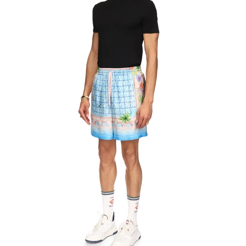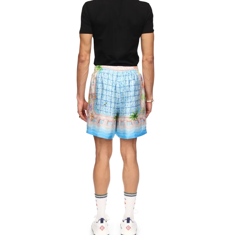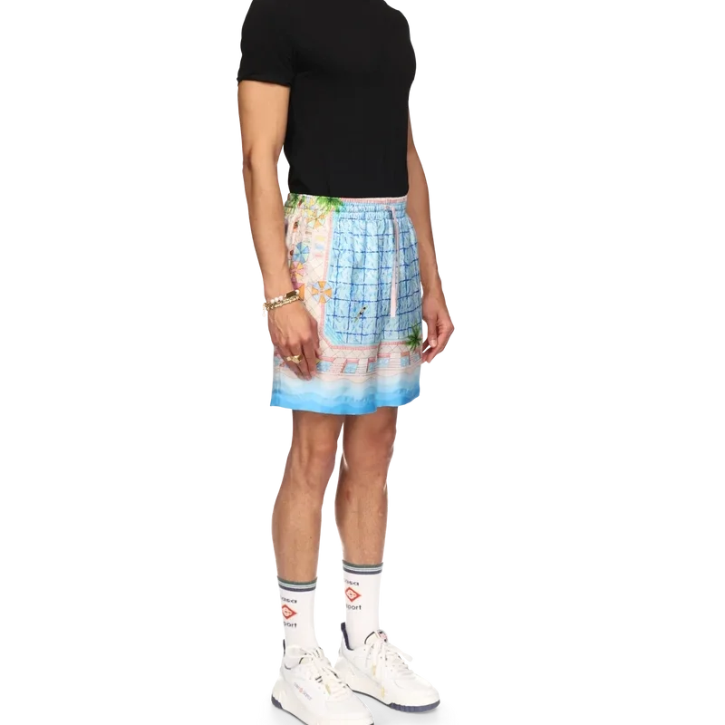 Los pantalones cortos de seda Le Plongeon presentan un diseño familiar confeccionado en tejido de sarga de seda estampada y cuentan con un diseño de temporada inspirado en un hermoso día en la piscina del hotel y el idealismo de los viajes visto desde arriba, lo que ofrece una nueva perspectiva. La paleta de colores es clara e idealista, compuesta por suaves tonos pastel. Se completan con una cintura elástica con cordón de ajuste, bolsillos laterales, un bolsillo trasero y detalles de rayas degradadas en contraste inspiradas en la ola de Memphis en el dobladillo.
