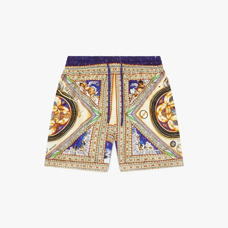 Los pantalones cortos de seda Plafond Orne De Musique presentan un diseño refinado confeccionado en tejido de sarga de seda, con motivos inspirados en los elaborados y intrincados techos pintados del Renacimiento que representan los temas atemporales de la música y la danza. Cuentan con una cintura elástica, cierre con cordón, forro, bolsillos laterales en las costuras y un bolsillo trasero de parche.