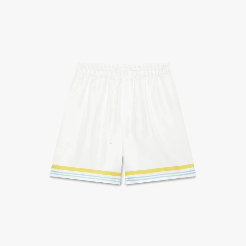 Los pantalones cortos de seda Tennis Landscape presentan un diseño refinado, con el estampado Tennis Landscape, donde marcos interconectados crean nichos de diferentes escenas que describen la trascendencia del tiempo y el lugar a través del enfoque del deporte. Cuentan con una cintura elástica, cierre con cordón, forro, bolsillos laterales en las costuras, un bolsillo trasero de parche y detalles de rayas en el dobladillo y los bolsillos.
