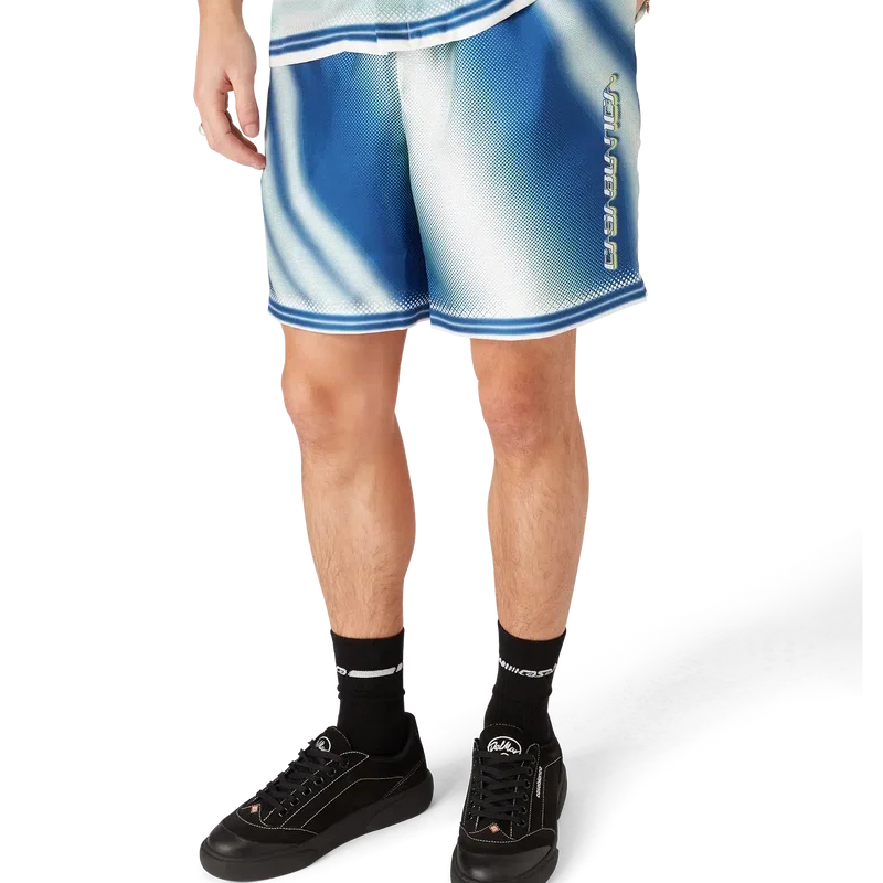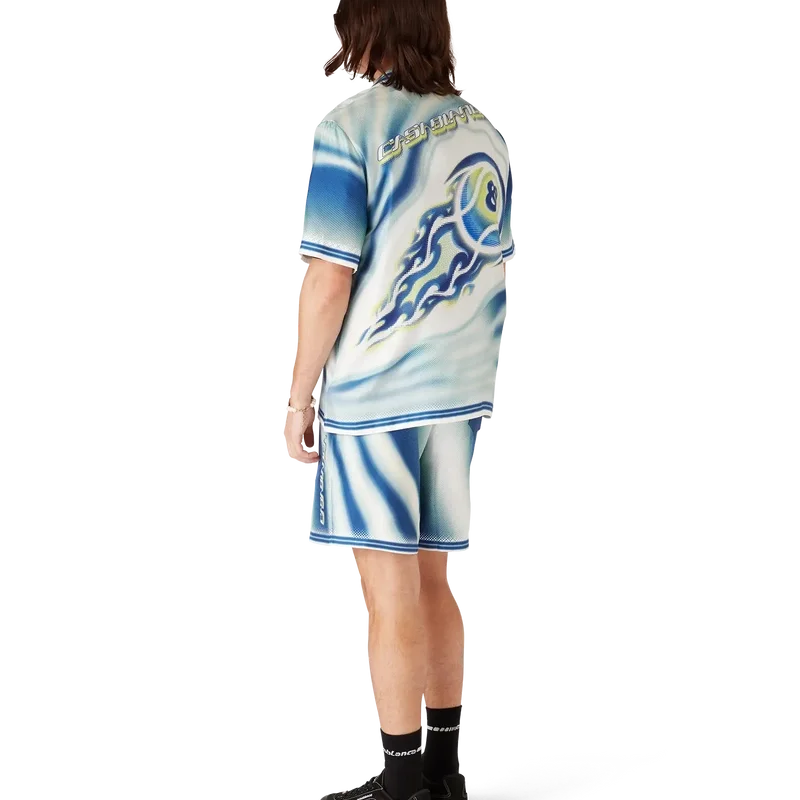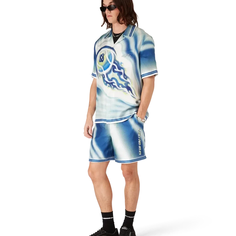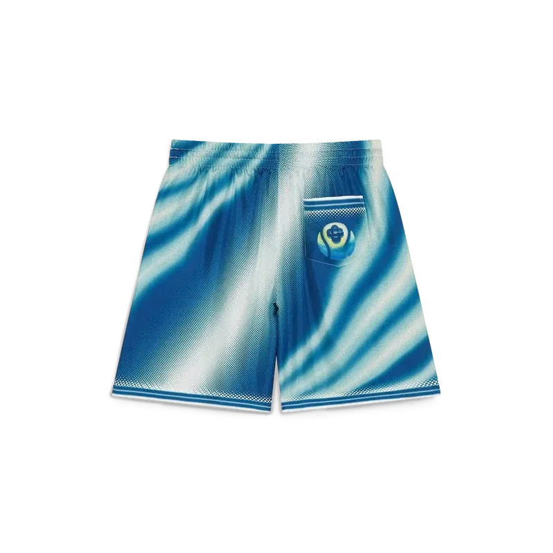 Los pantalones cortos de seda The Art of the Serve presentan un diseño estampado en toda la superficie con el característico motivo de la marca: una pelota de tenis en vuelo, que refleja el equilibrio fundamental entre potencia, velocidad y control. Cuentan con cintura elástica, cierre con cordón, bolsillos laterales en las costuras, un bolsillo trasero de parche, detalle de rayas en el dobladillo y el logotipo de Casablanca.