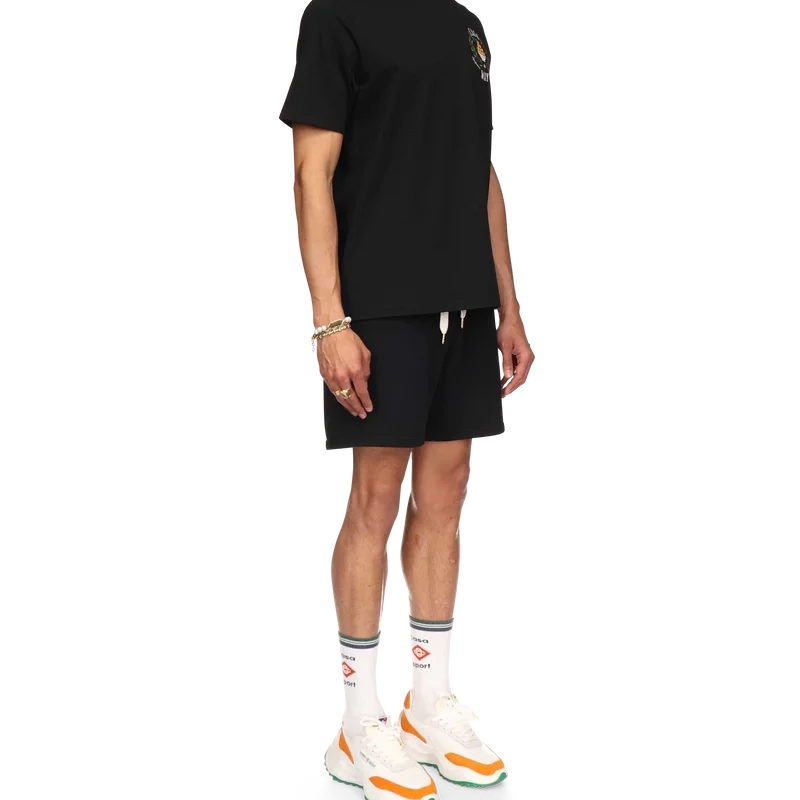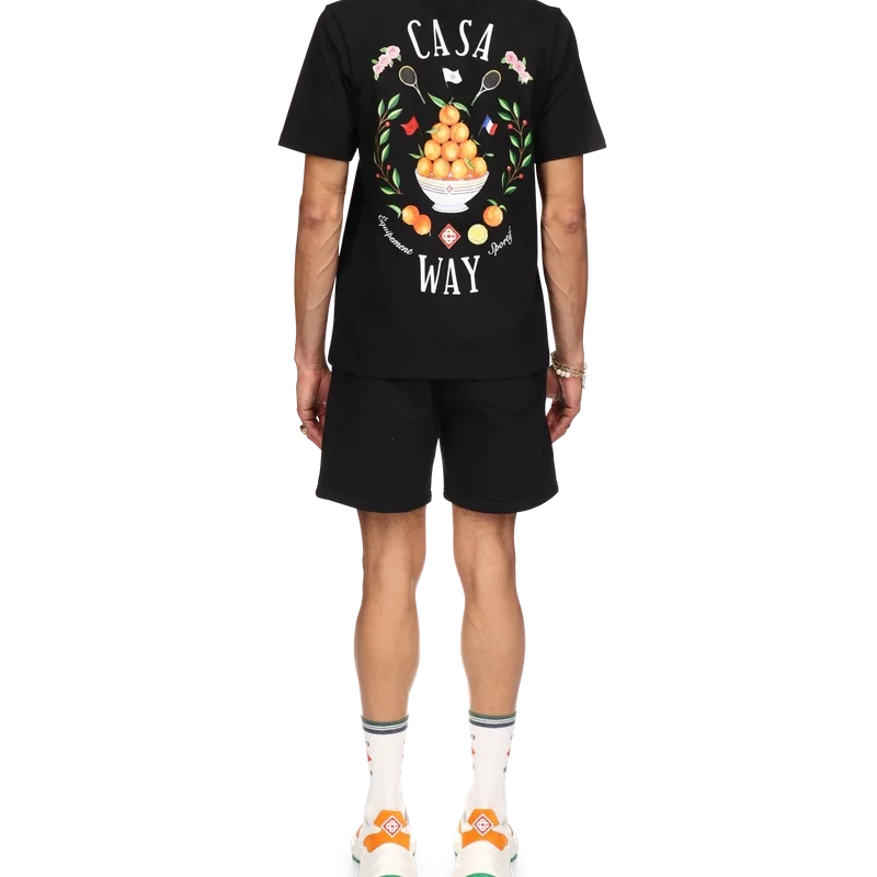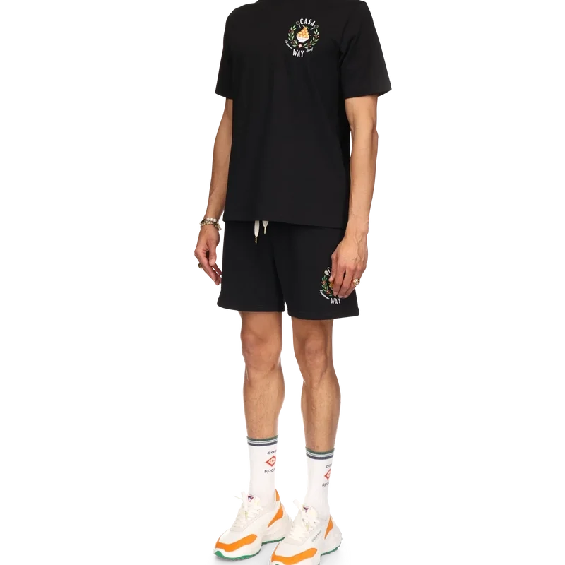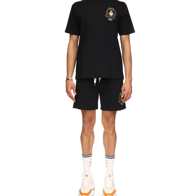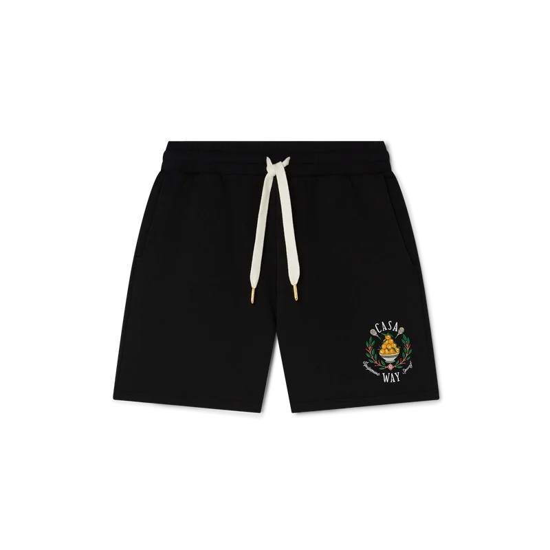 Los pantalones cortos de sudadera Casa Way están confeccionados en algodón orgánico y presentan el diseño característico de la casa con ilustraciones bordadas de equipamiento deportivo y detalles florales reinterpretados para esta temporada. Se completan con un cordón de cierre con puntas doradas, bolsillos laterales inclinados y un bolsillo trasero.