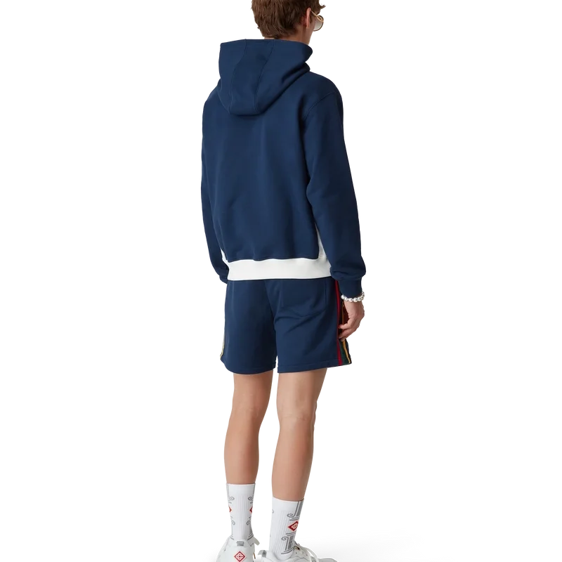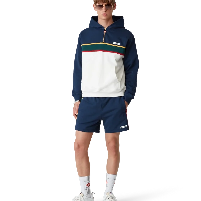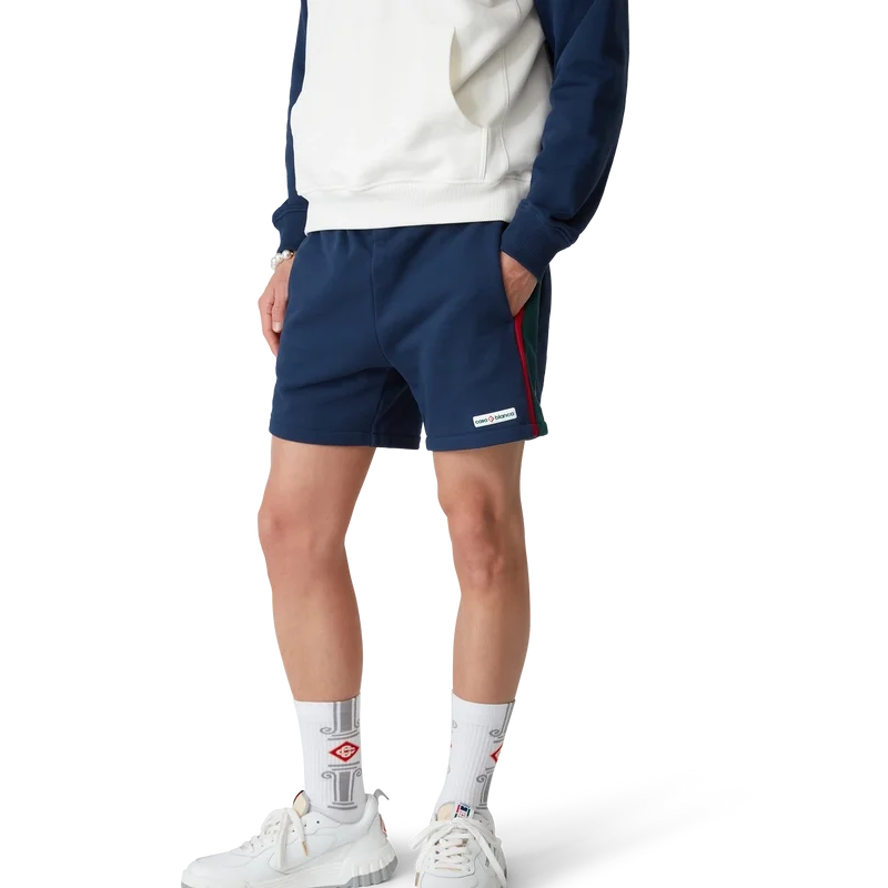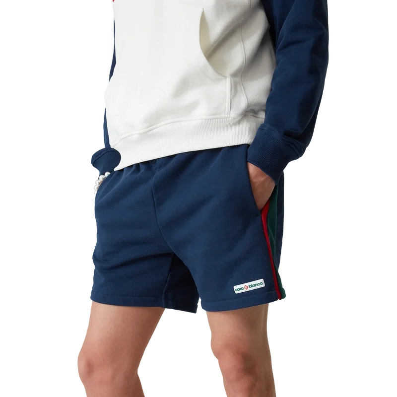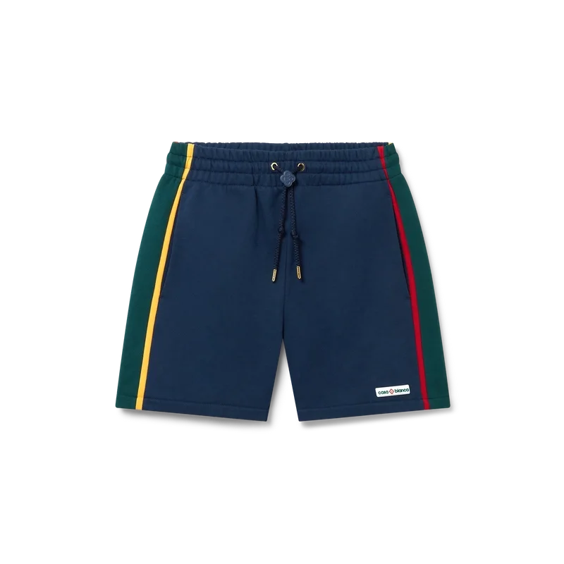 Los pantalones cortos de sudadera con bloques de color son un diseño deportivo, confeccionados en algodón orgánico y con el logotipo en parche característico de la casa. Se completan con un cordón de cierre con puntas doradas, bolsillos laterales en las costuras, un bolsillo trasero y detalles de ribete en contraste.
