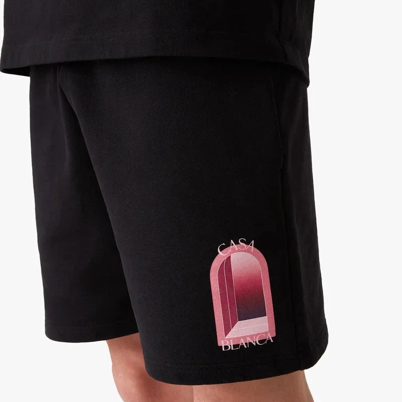 Los pantalones cortos de sudadera negros L’arche presentan un diseño refinado, con un diseño serigrafiado característico del Arco, un símbolo abstracto de fuerza. Se completan con una cintura elástica, cordón de ajuste con puntas doradas, bolsillos laterales y un bolsillo trasero de parche.