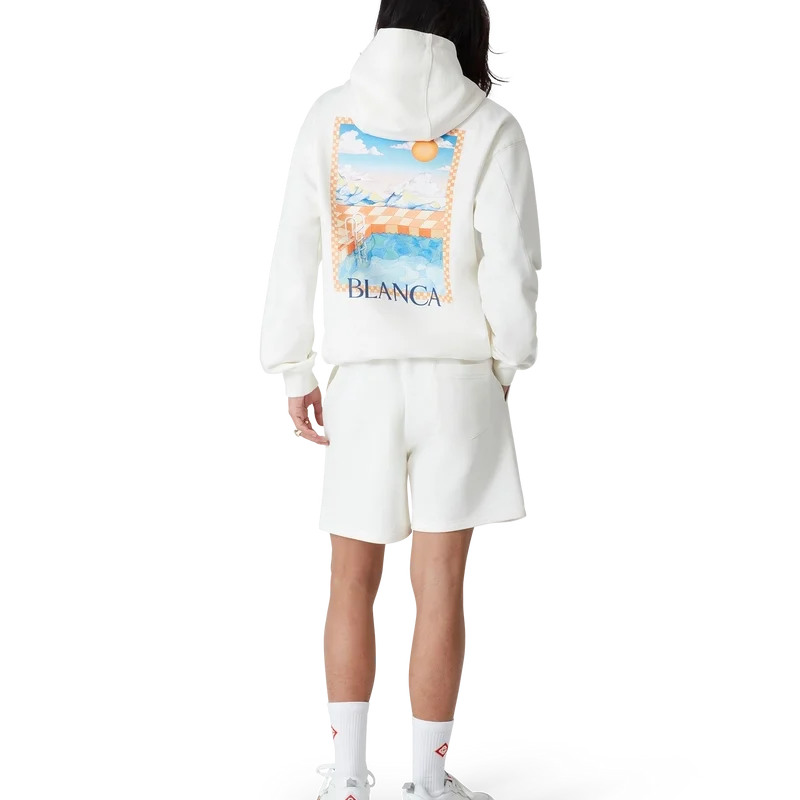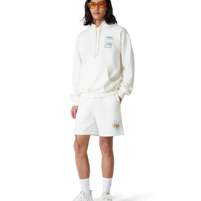 Los pantalones cortos de chándal Oasis presentan un diseño estampado confeccionado en tejido de algodón orgánico, con el arte de temporada de la casa y elementos de diseño inspirados en la naturaleza, la arquitectura y el tenis. Cuentan con una cintura elástica, cordón de ajuste con puntas doradas, bolsillos laterales en las costuras y un bolsillo trasero de parche.