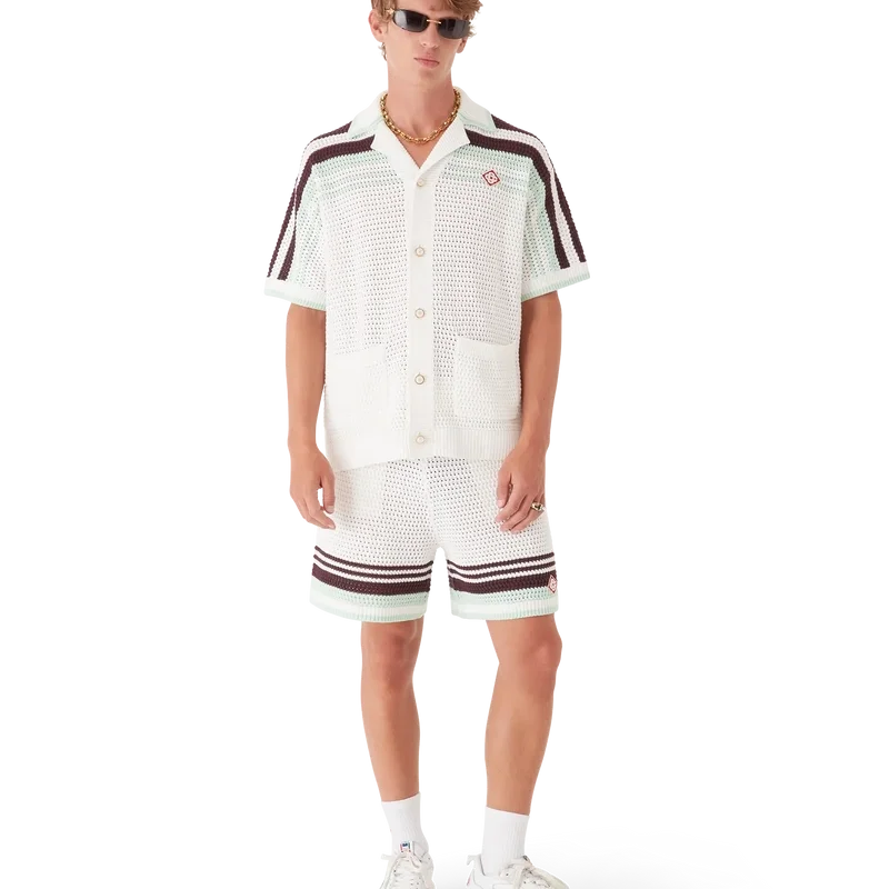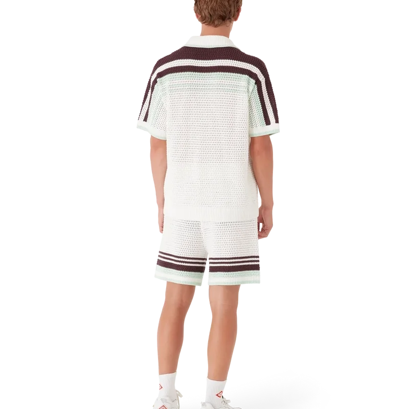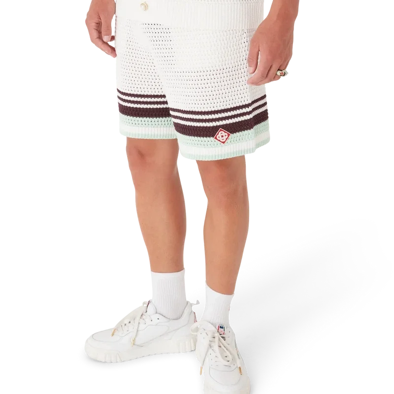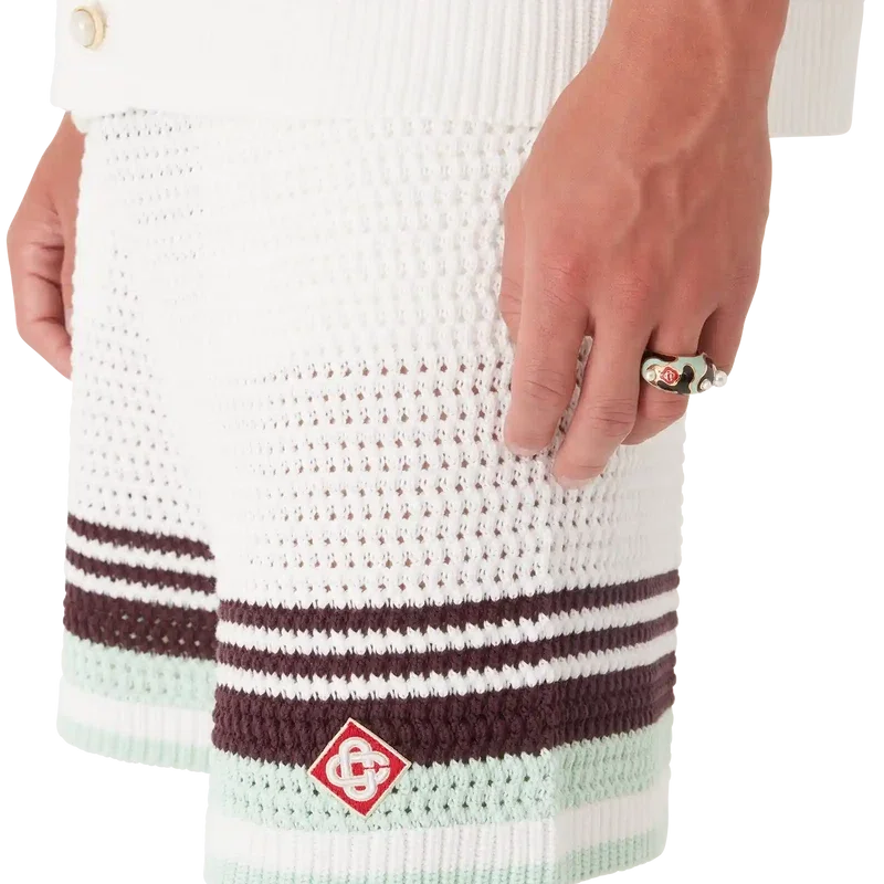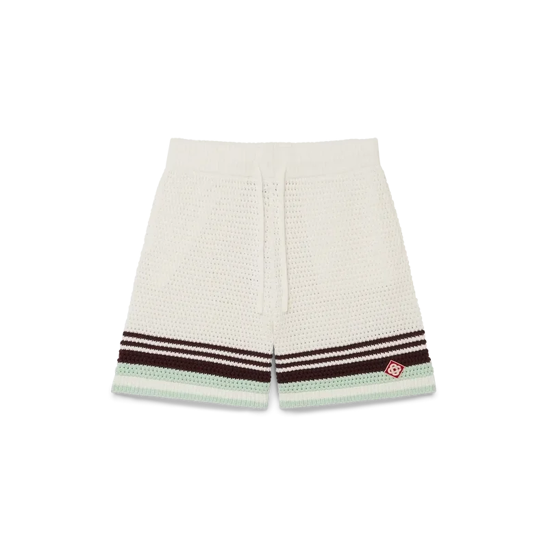 Los pantalones cortos de tenis de ganchillo son un diseño clásico confeccionado en tejido de algodón de ganchillo en suaves colores naturales y con el logotipo del diamante característico de la casa. Se completan con una cintura elástica, bolsillos en las costuras y detalle de rayas en el dobladillo.